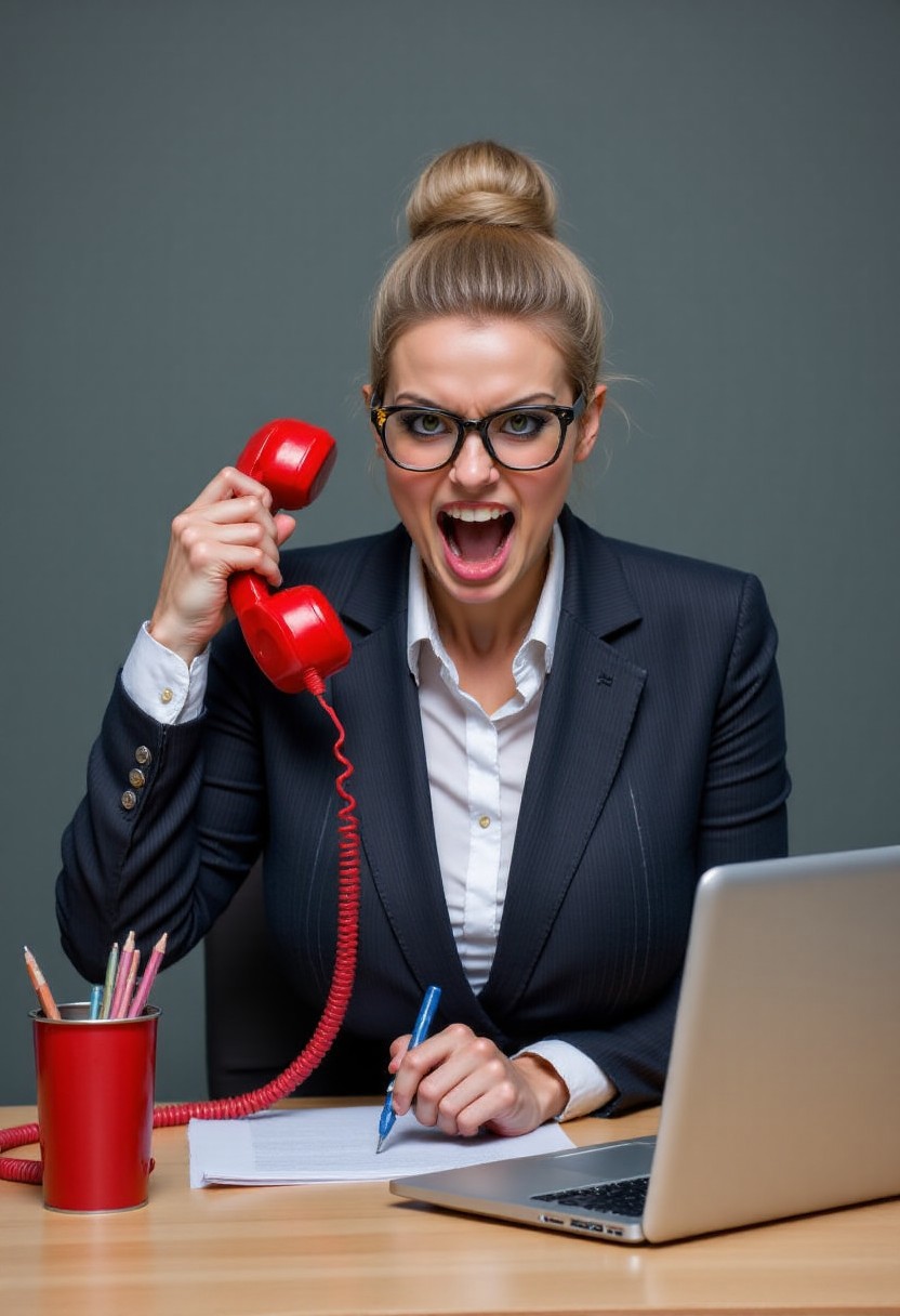 A furious businesswoman screams into a red rotary phone while working at her desk. She is holding the phone out at arms length ((looking at the phone)) shouting at the phone. ((not looking at camera)). The image shows a blonde woman with her hair styled in a bun, wearing black and white pinstripe blazer and tortoise-shell glasses. She is sitting at a light-colored wooden desk, her expression one of intense anger and frustration. Her mouth is wide open in a yell, and she’s gripping a bright red rotary telephone receiver in her right hand, held high. A long red coiled telephone cord snakes across the desk. Her left hand is holding a pen, seemingly mid-sentence on a document. A silver laptop computer sits on the desk in front of her, slightly angled away from her. A red metal cup or holder containing several red pencils is next to the laptop. The background is a plain, muted gray-green, keeping the focus firmly on the woman's angry outburst. The overall mood is tense and dramatic, conveying a feeling of workplace stress and uncontrolled anger.