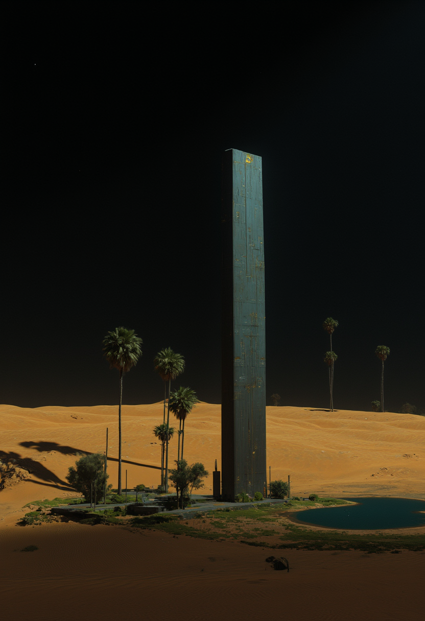 fashion photography,(full body:1), Endless black space, full body shot, sexy, mysticism, , dark, deep gradient, isometry and perspective. epic. Breathtaking endless desert with golden sand dunes stretching endlessly/ creating a feeling of huge scale. At eye level / in the middle of the desert is a small oasis island / surrounded by golden sand. The island is covered with lush green grass, and a crystal clear lake stretches around it, reflecting the starry sky. Several tall palm trees gently sway in the wind, giving the landscape a sense of life. On the island there are ancient ruins with glowing mystical runes, partially covered with sand. Fireflies dance around the ruins, radiating a soft magical glow. Above, the sky is darkened by a solar eclipse, revealing a dark blue night filled with countless twinkling stars.. Gray tones with a touch of whimsical realism, evoking nostalgia and fear and a craving for travel.. ., , , .The atmosphere of the other world. Epic.. The overall composition seems cinematic, combining high fashion with science fiction aesthetics. . . (depth of field), low saturation, detail. ,. , low saturation,detail. mythp0rt Stylish, charismatic. ,,aidmamj6.1,ne0nfant4sy, The background is minimalist, a gradient of shadowy blue tones, amplifying the ethereal and futuristic ambiance of the scene. . Thin border of tiny maple leaves that glitch and fade around the edges overlaid on a black border background., transparency, reflections, Roger Dean, Rodney Matthews,,, dark gothic fantasy,soft diffused lighting, subtle light scattering, gentle highlight diffusion, muted reflections, solid black background, towering impossibly tall illithid mind flayer, elongated shadow stretching toward unseen sinister presence, slender otherworldly form, faint flickering streetlight glow, malevolent intelligence, foreboding dread, lurking unseen horrors, soft refractions, ambient effects, mysterious ominous mood,, ne0nfant4sy, jitostyle, R3alisticF, . igiex. .UNI_SCI_FI_CORE.