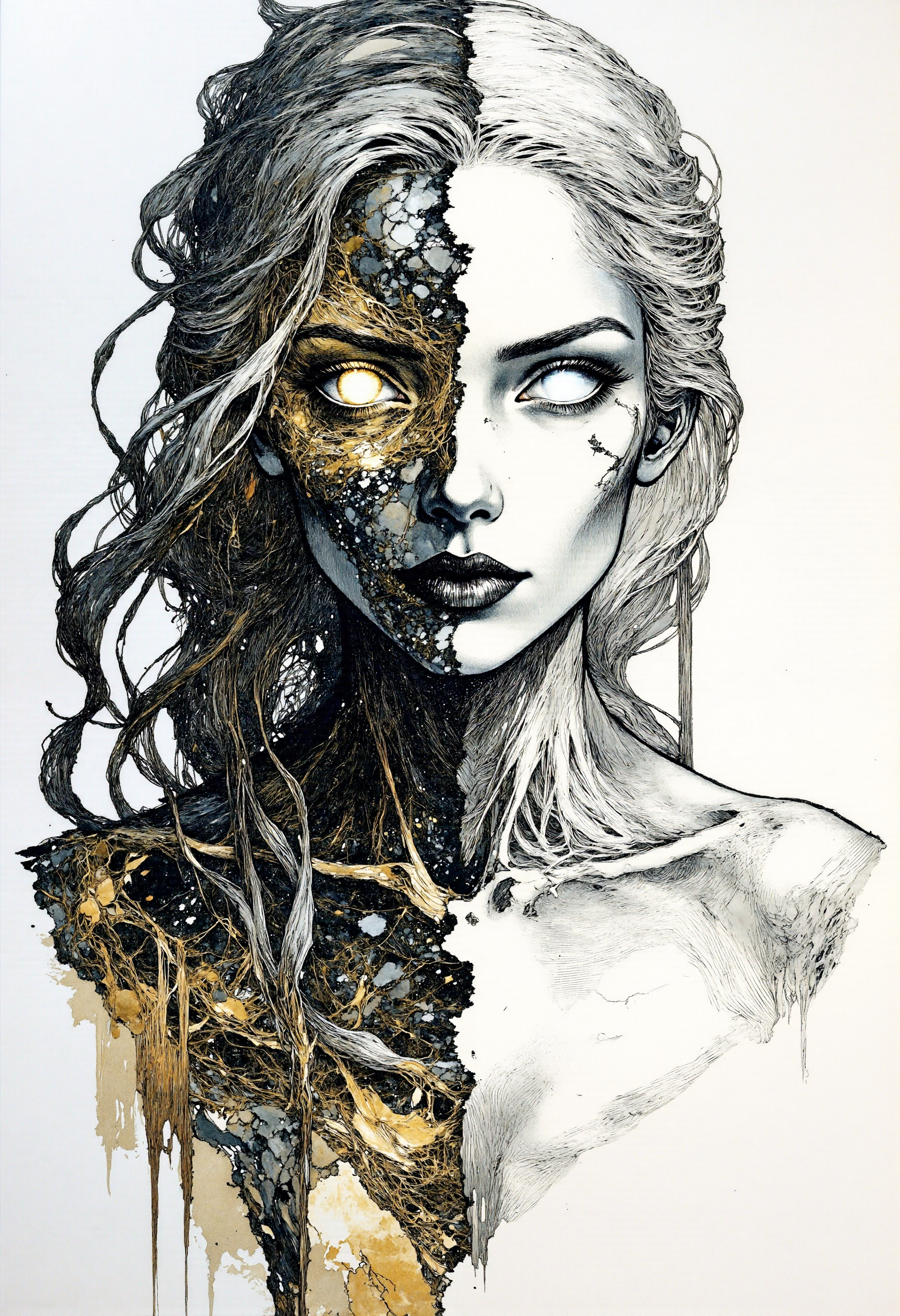 fg, A portrait of Hel, the ruler of Helheim. Her marvelous wild mane covers part of her beautiful face and bare chest. Both eyeballs are completely blank and featureless, devoid of pupils and irises, and extend across the entire eye region, blending seamlessly into the surrounding facial area, while the eyes remain fully open. The face is divided into two halves. The left side shows signs of decay and decomposition, with lifeless dark-coal skin, hard bones are visible under the torn skin, shreds of golden ash detached from her skin. Her left eyeball is completely golden. The right half of the face is of unearthly beauty, with immaculate, flawless white skin. Her right eyeball is completely snow-white. The transition between the two halves of the face is fluid and unobtrusive, symbolizing the brief moment between life and death. The picture showcases a surreal and abstract style, created using pencil and ink, characterized by a monochromatic scheme with predominant shades of black, white, and gray, which has been digitally enhanced.