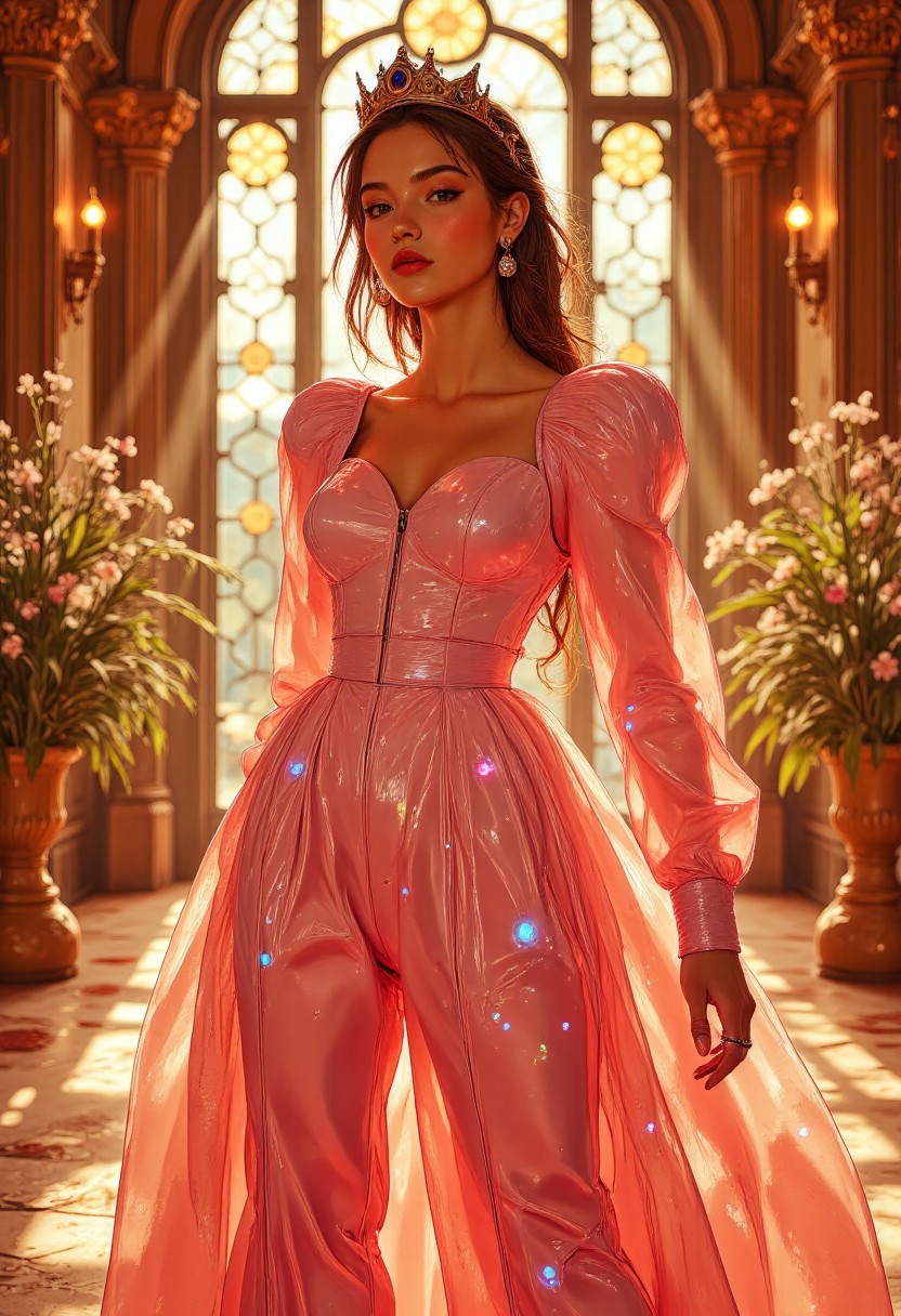 A high-fashion editorial photograph capturing Princess Peach's castle aesthetic. A female model with serene poise stands in a castle ballroom where stained glass windows filter prismatic light. She is cheerful, dancing pose, closed eyes. She wears an avant-garde gown: a structured pale pink bodice with geometric pleating at the shoulders, transitioning into a billowing organza skirt in sunset hues from blush to coral. Hidden pockets in the skirt contain tiny illuminated crystals resembling power stars. Her accessories include a modern crown of delicate gold wirework with floating sapphire and diamond elements hovering above her elegant updo. Her makeup features a luminous complexion with subtle rose-gold highlights and bold blue graphic eyeliner. The environment blends classical architecture with Mushroom Kingdom elements - ornate mushroom-shaped pillars and doorways, with blurred Toad attendants in the background. Golden hour light streams through windows, creating dramatic shadows and highlighting the garment's luxurious textures. Ultra-detailed craftsmanship, editorial composition, 8K resolution. J_art