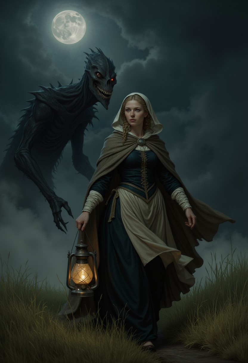 A night scene in the countryside, a British woman in appropriate medieval clothing walking through a paddy field. She wears a long, dark woolen kirtle with fitted sleeves, a high neckline, and a ground-length hem, layered with a front-laced bodice. Over her dress, she wears a linen apron tied at the waist and a woolen cloak with a hood draped over her shoulders for warmth. Her hair is neatly braided and partially covered with a simple linen wimple and veil, traditional to medieval England. In her hand, she carries a metal lantern, its warm candlelight illuminating the grass and her lower garment. The moon is high in the night sky, casting silver light over the misty field, creating deep shadows and a serene glow. Behind her floats a black ghastly creature with a stretched skeletal face, sharp jagged teeth exposed, and glowing red eyes. Its elongated arms reach forward, and its ghostly body dissolves into mist, blending with the night air. The woman walks calmly, unaware of the terrifying presence behind her, her expression focused on her path through the quiet, haunted landscape. YFG-P@int
