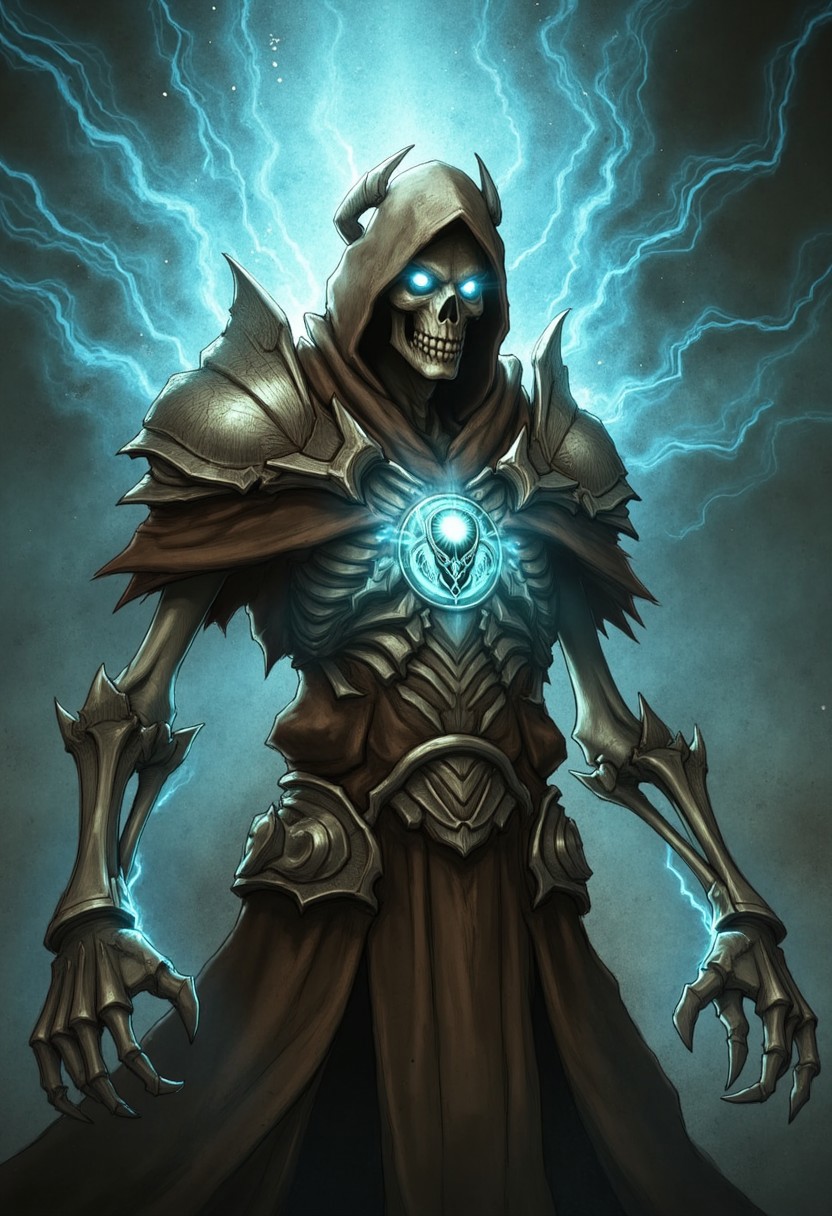 image in a sepia-toned, digital drawing with a dark, gritty, and dramatic D3CSPS-V1.0 style that features A spectral and eerie figure dominates the image, shrouded in an ethereal aura of icy blues and luminous light. This skeletal sorcerer exudes an otherworldly presence, its form wrapped in tattered robes that ripple and dissolve into mist as though consumed by an eternal frost. The armor beneath the decayed fabric glimmers with a metallic sheen, its surface adorned with intricate patterns of arcane design. The centerpiece is a glowing amulet embedded in the chest, radiating a cold, bluish energy that pulses outward, casting shifting light across the surrounding haze. The skull of the figure is crowned with a jagged, ceremonial headpiece that appears ancient, its sharp edges illuminated by a spectral glow. The empty eye sockets blaze with an intense, piercing light, as if harboring the icy flames of undeath. Strands of energy coil around its bony hands, hinting at the destructive magic it commands. Each bone is finely detailed, with cracks and engravings suggesting the weight of time and dark enchantments. The background is a swirling abyss of frosty winds and glowing particles, rendered in deep, celestial blues that evoke a void-like expanse.