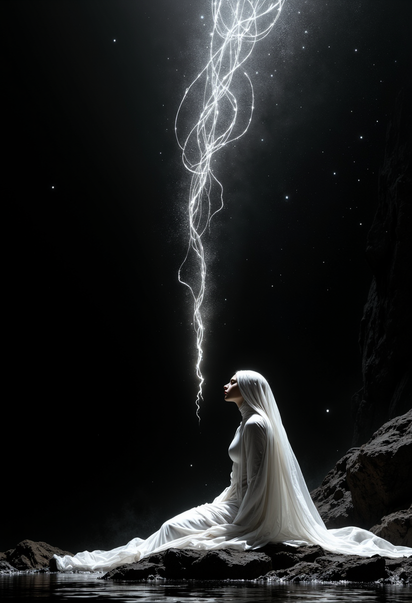 A spectral figure, half-formed from wisps of silver and shadow, rises from the still body below. The soul, luminous and fragile, drifts upward, dissolving into the vast, obsidian void speckled with fading embers of existence. Ethereal ribbons of light stretch and coil around the departing essence, whispering the echoes of forgotten dreams. The air shimmers with an eerie, unearthly glow—both mournful and divine. A silent wind carries the final breath into the infinite unknown, where the veil between life and eternity shivers and parts. Beauty and sorrow intertwine in a delicate ballet of departure, as the universe inhales the lost soul into its boundless embrace., , masterpiece, ,Image quality, , CPA, UNI_SCI_FI_CORE.