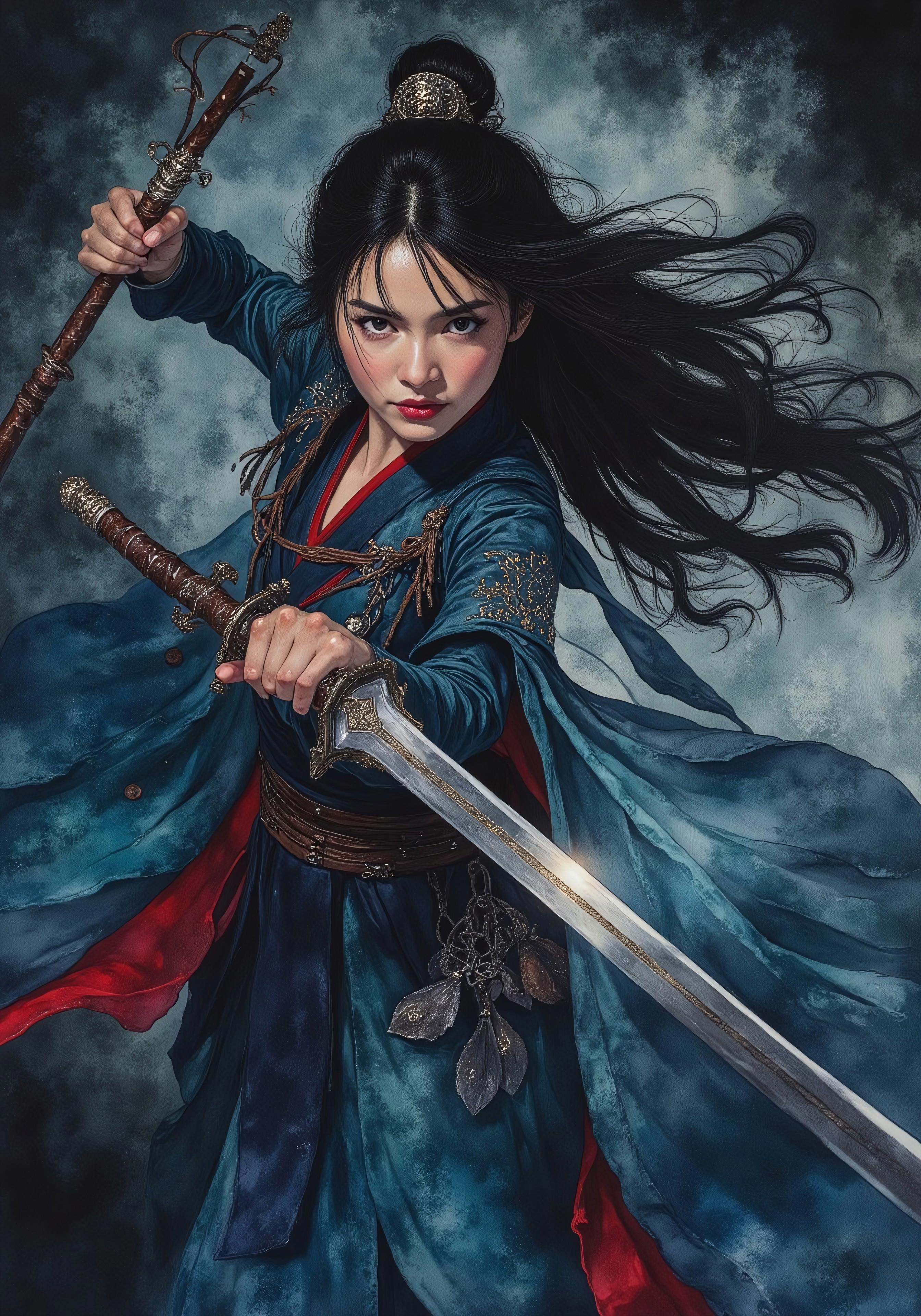 Realistic portrait. Dark. (Mulan from Disney). (Chinese woman). Chinese sword. Evil. Villainess. Blue dress with red accents. Warrior. Attack stance. Detailed angry face. Sinister.