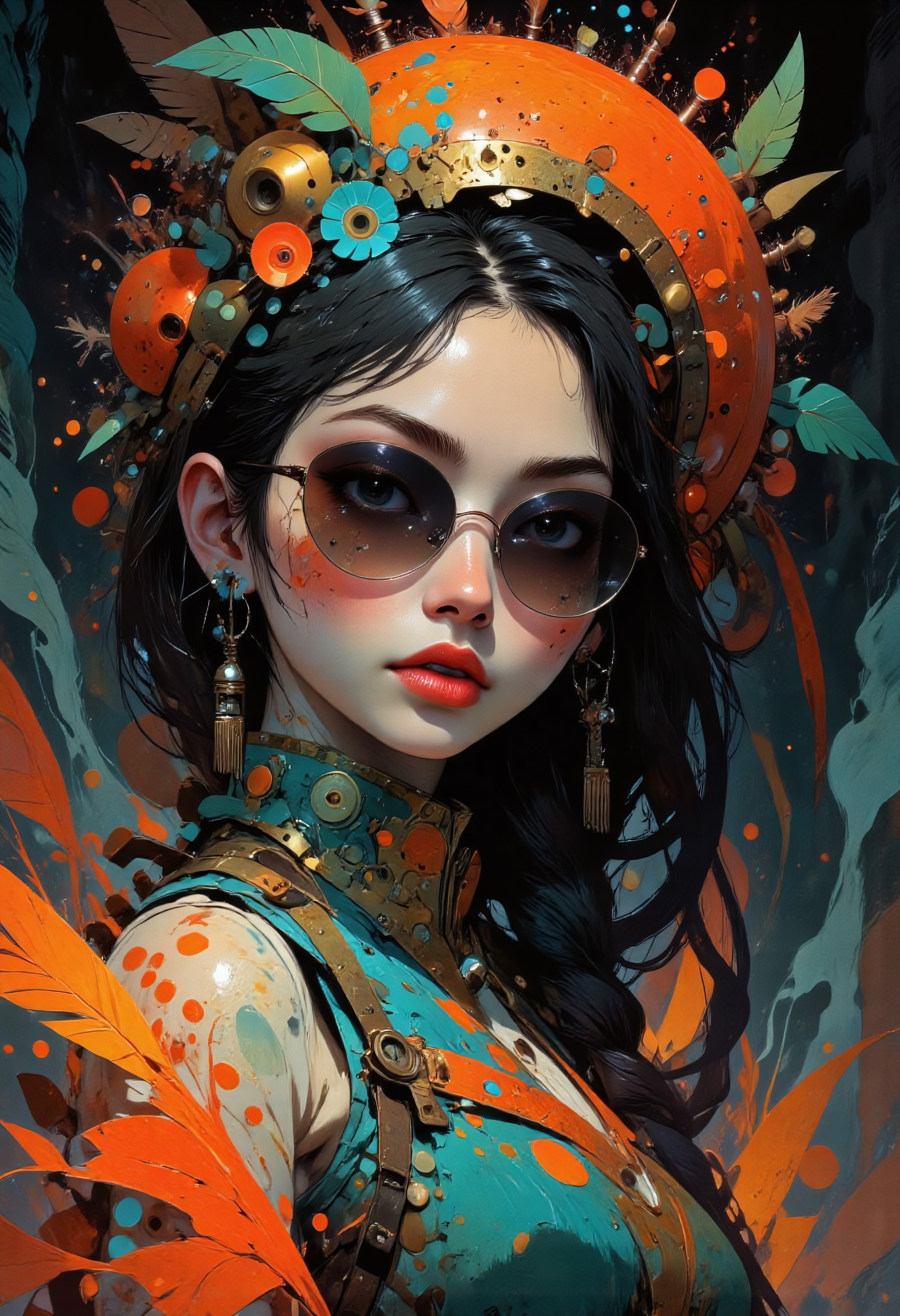 fantasy-style portrait of a girl wearing pirate attire and sunglasses, vibrant color scheme, otherworldly illustration, realistic color tones, havencore aesthetic, dark cyan and light amber contrast, infused with orientalism and manapunk elements, dynamic settings, magical atmosphere, high detail, illustrated with intricate designs, immersive scenery, enchanting backdrop, 4K ultra-detailed quality. The lighting enhances her features, creating a soft interplay of light and shadow, while the high-resolution quality captures every detail with photorealistic clarity, ppstorybook
