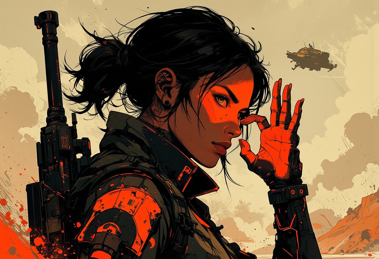 in the style of ck-mgs, nistyle, Inkplash art on rice paper, sepia, henna, Silhouette Art, magnificent, inksplash, closeup portrait, female bounty hunter, flowing black hair, reflective black and neon red armor, futuristic armor, a rifle strapped to her back, holstered pistol, holding hand up to block dust flying in her eyes, abstract background suggesting a harsh desert world, Spaceships flying overhead, dust storm, windy, Cowboy Shot, close up,