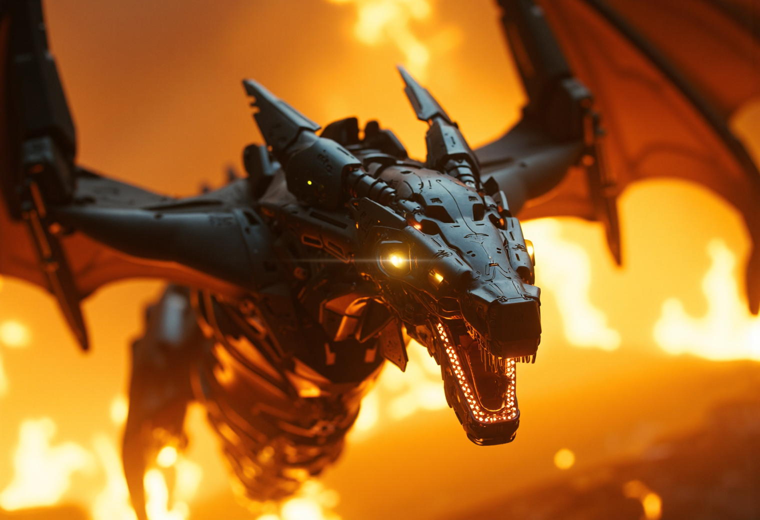 SCI_FACTOR_CORE A futuristic (DRAGON:1.35) cyborg with a sleek, high-tech design,(dragon flying:1.25), fire arround