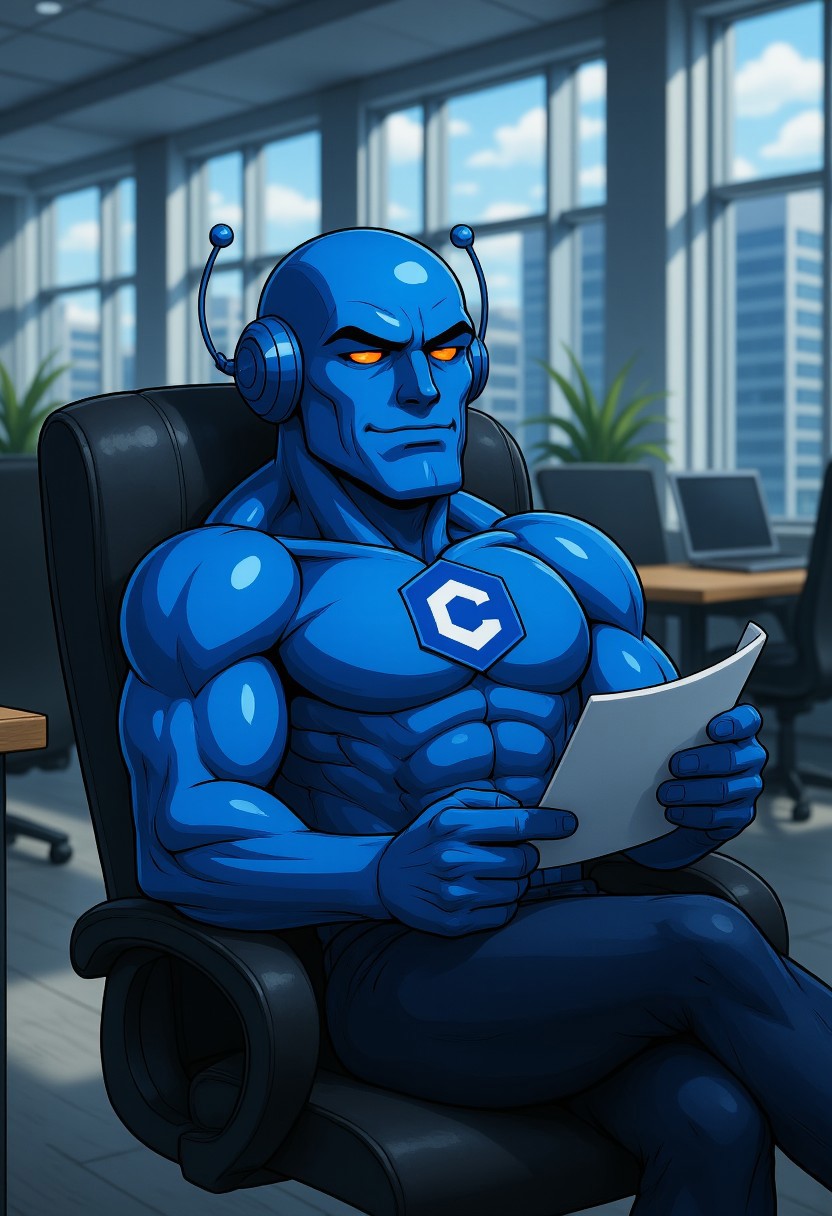 CivBot, gigachad, sigma male, orange glowing eyes, robot, blue, in a corporate office, leaning back in a chair, relaxed