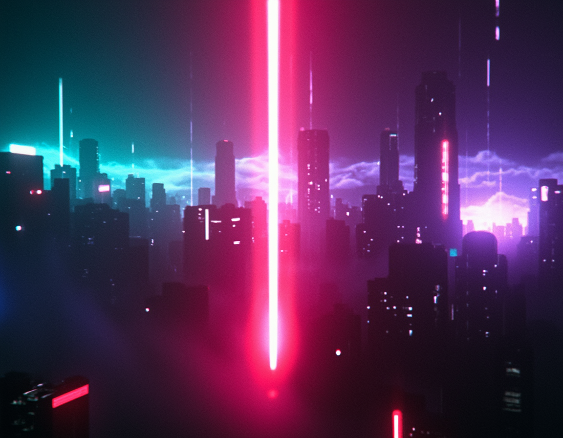 style of UNI_SCI_FI_CORE. Monochrome with color, retro scan of 80s-anime-ai spectral neon Gradient ascii_art, a 80s Sci-fi Ethereal. Dark space, 80`s sci-fi book artwork, lofi, neon-pastel colors, grainy, vintage Create a vivid description of a distant cyberpunk mega city in the universe where enormous structures are visible from space, flying cars and starships in the sky, light trails, cyberpunk building towering over the landscape in an awe-inspiring display. n30nfilm, vantablack