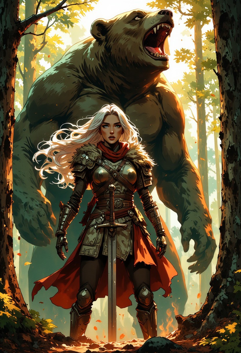 Close up of a powerful big bear and warrior woman with flowing silver hair, clad in a battle-worn yet regal dress adorned with fur and metal embellishments and big sword. She stands fearlessly in an enchanted forest, her piercing gaze locked ahead. Behind her looms a massive brown bear, its mouth open in a fearsome roar, eyes glowing with primal energy. Dappled sunlight filters through the towering trees, casting a warm yet eerie glow over the scene. The air is filled with swirling embers and leaves, creating a sense of motion and magic. The composition is dynamic, with the woman and the bear occupying most of the frame, emphasizing their deep bond and shared power. Cinematic lighting, highly detailed textures, and a painterly fantasy style.