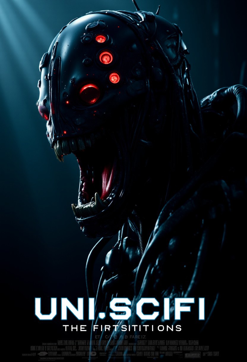 SCI_FACTOR_CORE, photorealistic, detailed, An epic sci-fi horror movie poster. A three-quarter view portrait of a horrifying non-humanoid biomechanical creature of eldritch horror emerges from the dark background. The scene is a dark industrial setting. The movie title 'UNI_SCI-FI' written at the bottom of the image in futuristic font with glowing trim. aidmatextimprover, high contrast