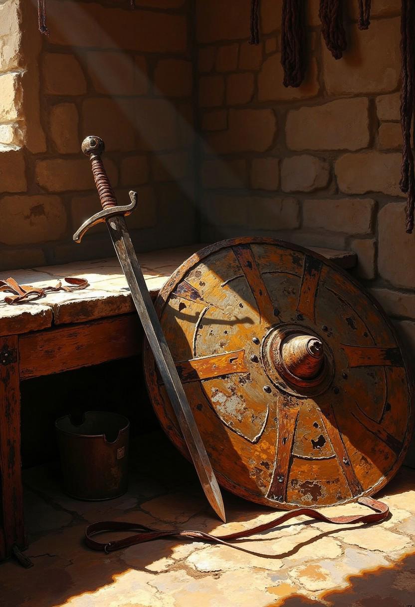 The image captures a quiet corner of a stone-walled barracks, lit by the golden slant of late afternoon sun filtering through a narrow window. Propped against a wooden bench, a well-worn sword leans slightly, its leather-wrapped hilt darkened by years of sweat and use. The blade, though clean, bears the soft scuffs of countless drills and skirmishes—honest marks of survival, not ceremony. Beside it, a round shield rests on the floor, its surface marked with faded paint—a once-bold emblem now chipped and dulled. Dents and scratches scatter across its face like a history written in iron and impact. A leather strap trails across the rough stone, as though it was set down only moments ago. The room around it is spartan—rows of bunks, hanging cloaks, the faint scent of oil and iron—but the sword and shield anchor the space with quiet weight. Tools of duty. Symbols of a soldier's life, waiting for the next call.