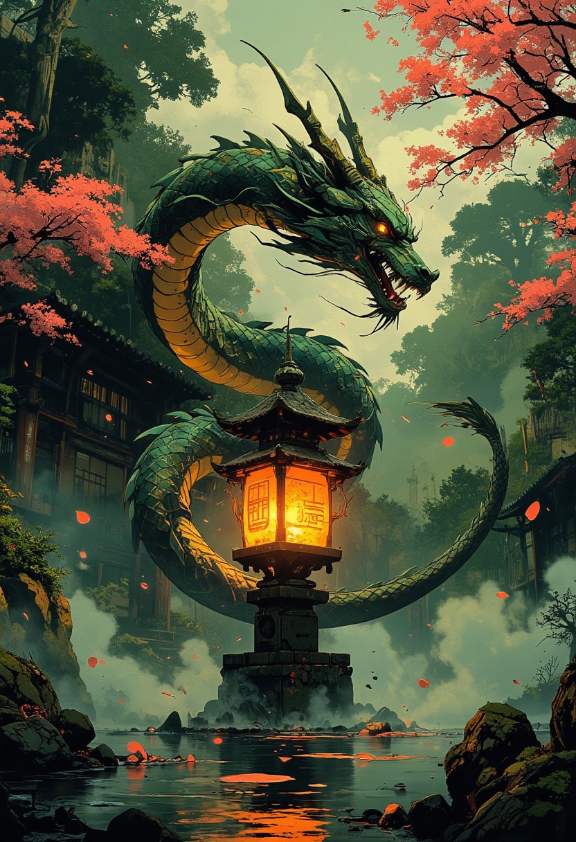 A majestic Chinese dragon with a long, serpentine body covered in shimmering emerald and gold scales, gracefully coiling around an ancient Japanese stone lantern in a tranquil garden. The dragon has no wings, yet it floats effortlessly through the air, its whiskers flowing with the breeze. Soft cherry blossom petals drift around as the lantern casts a warm, flickering glow onto the dragon’s elegant form. Mist rises from a nearby koi pond, reflecting the dragon’s mesmerizing movement. The atmosphere is a blend of traditional Japanese and Chinese aesthetics, evoking ancient wisdom, serenity, and mythical power.