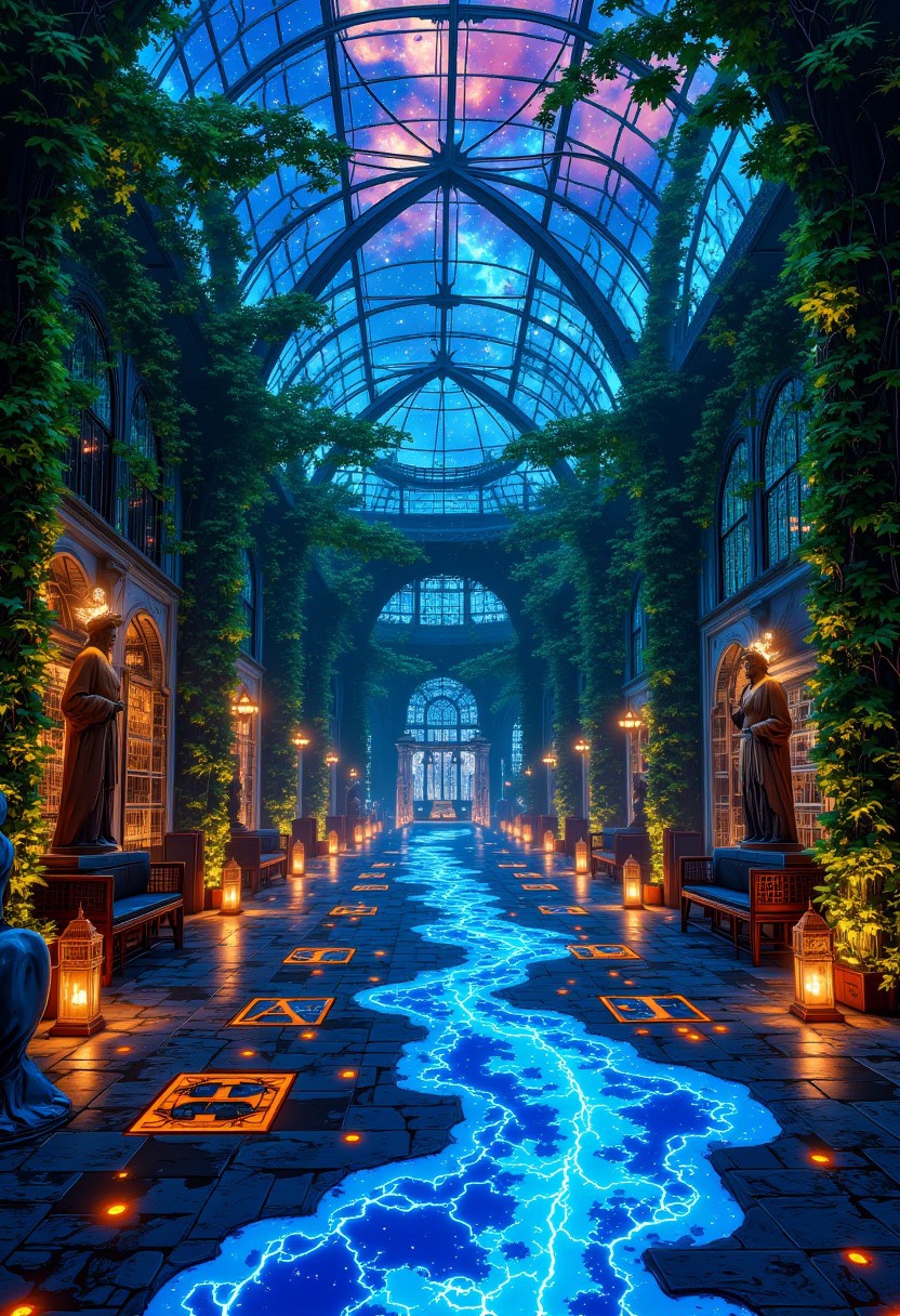 The Ethereal Bioluminescent Ballroom A grand celestial greenhouse, where the floor is made of darkened glass, reflecting a swirling galaxy beneath. Massive fern-covered archways, woven with crystal flowers and star-born vines, frame the room, their delicate tendrils moving as if sensing unseen forces. The ceiling, cracked by an ancient astral rift, allows tendrils of cosmic energy to slither down, wrapping around bronze statues of forgotten deities. The scent of lavender, ozone, and old parchment fills the air, while glowing runes pulse softly along the floor, counting down to an event no one remembers.
