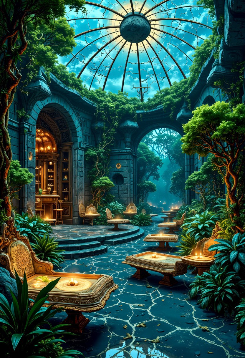 The Twilight Sanctuary of the Astral Bloom A botanical sanctuary infused with celestial energy, where the walls are covered in hand-carved depictions of mythical forests, their outlines traced in silver and deep green. The floor is made of bronze and dark marble, veined with creeping moss and glowing cyan vines. The ceiling is a cracked glass dome, allowing an eclipse-colored sky to shine through, casting shifting shadows on the floating platforms of bioluminescent flowers. The air is thick with the scent of sage, old wood, and the charged electricity of a storm just beyond reality, as the energy of the cosmos hums beneath every step.
