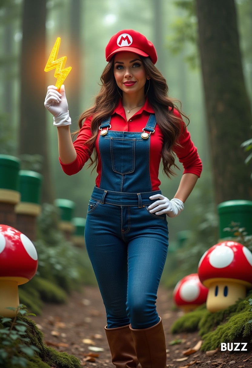 Professional photography of a sexy cosplayer woman, iconic character of the female counterpart of Super Mario, heroically beauty, her curvy figure adorned in her iconic red shirt and blue overalls with white gloves and brown work boots. Her distinctive red cap with its "M" emblem covers her long brown hair, framing her round face with rosy cheeks and bright blue eyes. Standing in a forest with big super mushrooms and goombas together with green tubes in the background. She hold up a big flat lightning icon in her hand, with the text "BUZZ" on the bottom of the image. Photorealistic style, cinematic lighting, hdr camera. live-action movie