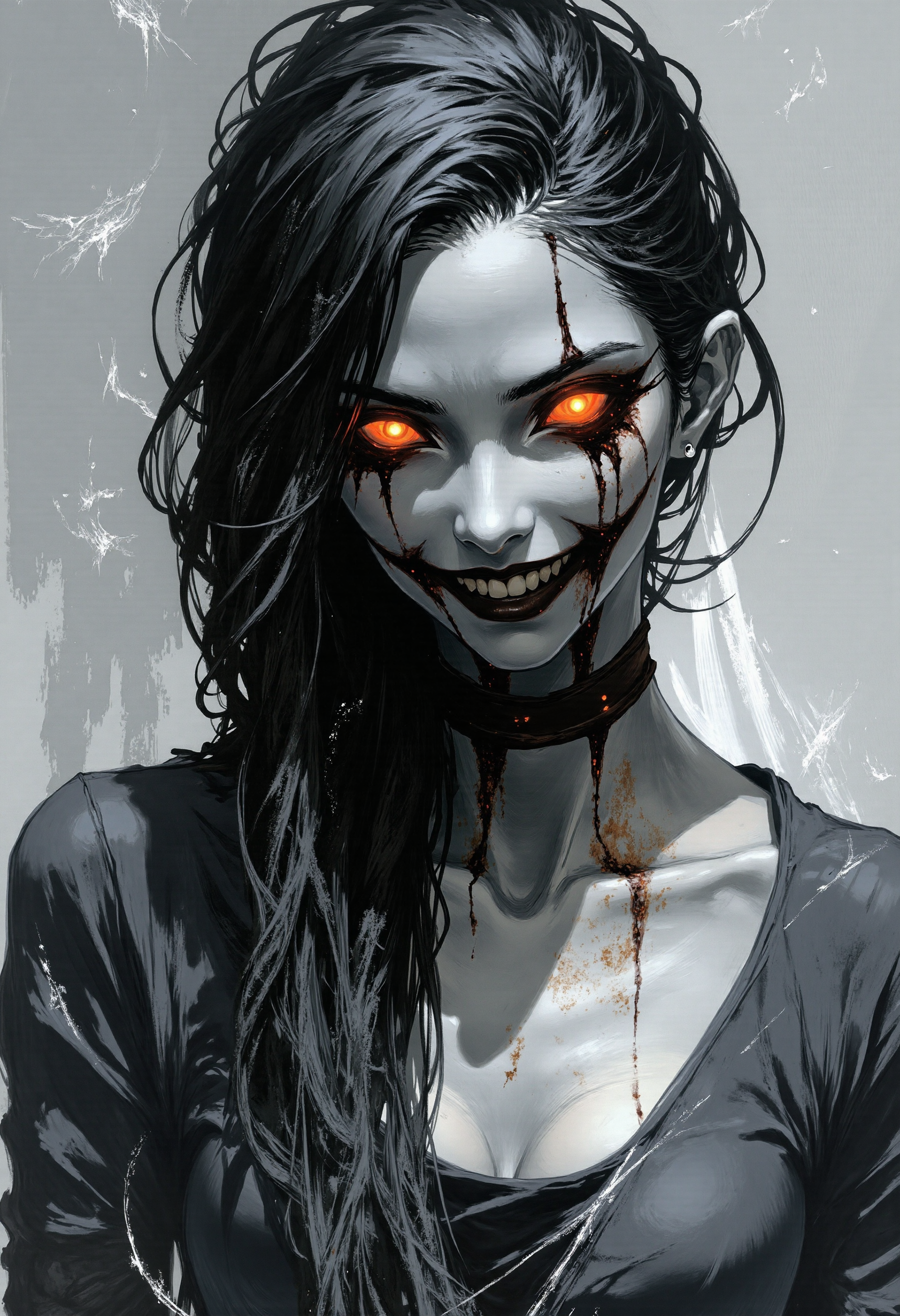 fg, A digital illustration of a woman with long, messy black hair framing her face, piercing glowing red eyes, heavy dark smudged makeup creating a sunken eye effect, a wide unsettling toothy grin. She wears dark, slightly ragged clothing, with subtle dark red smudges around her neck. Digital painting in the style of a dark fantasy horror illustration, eerie atmosphere, dramatic cinematic lighting, muted grey smoky background.