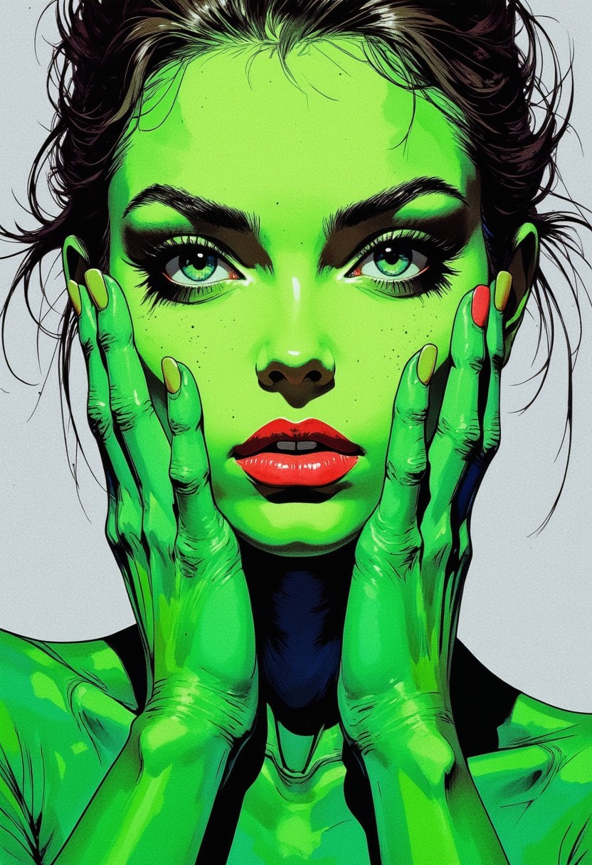 Close-up of a vibrant watercolor painting. A woman's portrait, rendered in a striking shade of green, is the focal point. Her skin tone, hair, and fashion are all a uniform, bold green. Her hair appears dark-brown at the top, transitioning imperceptibly to the same shade of green as her skin. Her features are highly stylized, with exaggerated and defined eyebrows, eyes, and lips that have a rich red hue. Fine details, like the texture of her skin and the subtle shading on her face, are visible. The woman's hands are positioned on her face, with a few clearly defined fingers of each hand. The background is a light gray/white tone, adding a stark contrast to the vibrant subject. The overall style is visually interesting, combining elements of a portrait with a stylized, almost surreal, presentation. The use of color and the way the light seems to be rendered suggests a deliberate choice of artistic representation rather than photographic realism.
