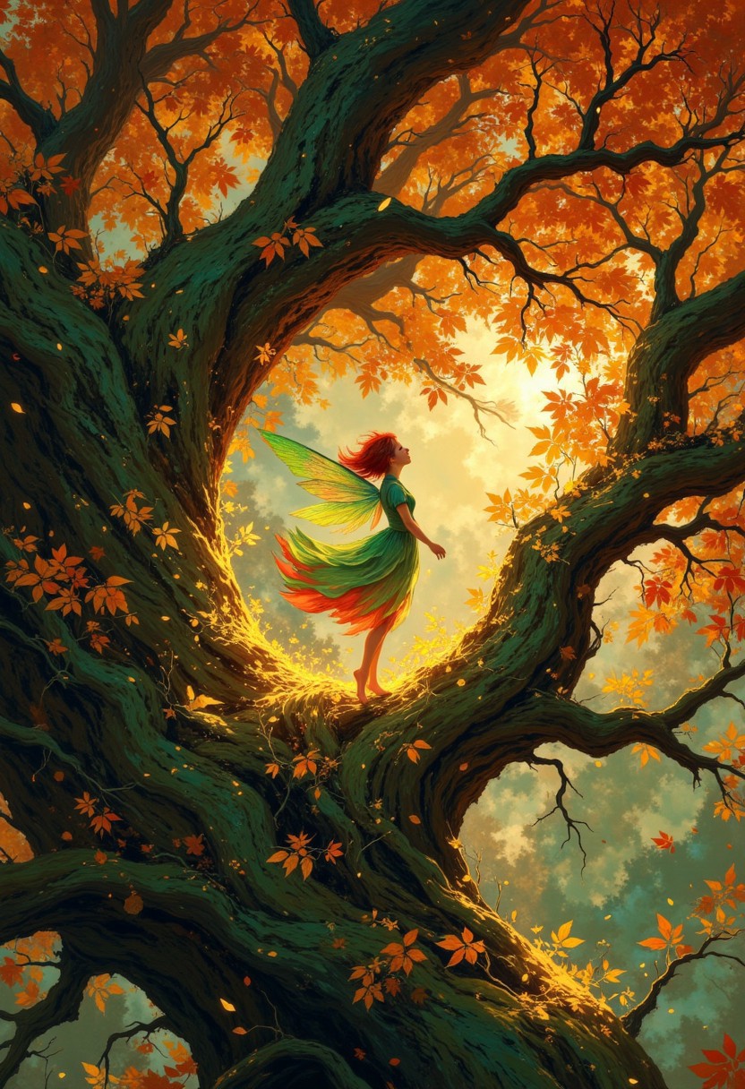 Masterpiece, best quality, ultra-detailed, 8K. A close-up view of a fairy-like otherworldly girl, with a shock of red hair that stands straight up, a pale green flowing ethereal dress that fades to red tones at the bottom flutters in the wind. She flies curiously around on fairy wings, translucent and shimmering with iridescent hues, through intricate, ancient branches, glowing with fiery amber and golden leaves. The leaves seem to pulse with magic, their edges shimmering as if dusted with molten light. Countless glowing motes of golden energy drift through the air, swirling like enchanted fireflies. The branches twist elegantly, their bark etched with faint, luminous runes that pulse softly. A warm, golden light filters through the dense foliage, casting sparkling reflections and ethereal shadows. The entire scene glows with an almost dreamlike radiance, filled with a sense of wonder and enchantment. Highly detailed, soft magical glows, fantasy dreamscape, cinematic lighting, rich autumnal hues, 8k resolution. DB4RZ, DB4RZ style painting, Anime art