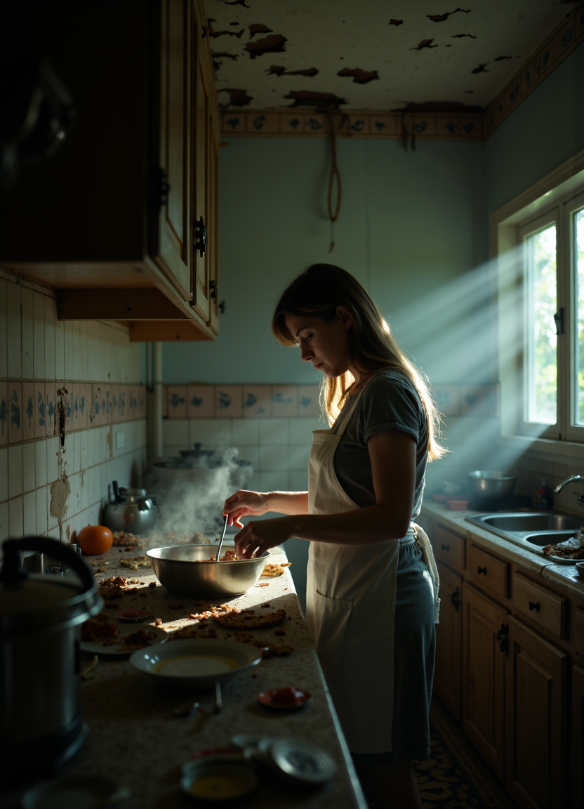 cinematic photo In this dimly lit kitchen, a young woman prepares dinner with meticulous care amidst the remnants of a long-abandoned space. The walls are cracked and broken, with missing tiles that reveal the crumbling structure beneath. The ceiling has partially collapsed, casting an eerie, flickering glow over her cooking activities. Despite the neglect and disarray, she wears white, cheerful apron, as if determined to bring some light into this dimly lit world. She moves deliberately around her cluttered workspace, expertly maneuvering within the confines of broken tiles that seem to threaten to swallow up everything in their path. As she works, the air is thick with the smell of rotting wood and a hint of damp earth, a testament to the kitchen's long history of abandonment and neglect. Despite this, there is an undeniable sense of purpose about her movements, as if every piece of food she adds to the pot or plate will bring her closer to something â perhaps hope, perhaps renewal, or perhaps simply a means to fill a stomach with sustenance in this forsaken place. . 35mm photograph, film, bokeh, professional, 4k, highly detailed