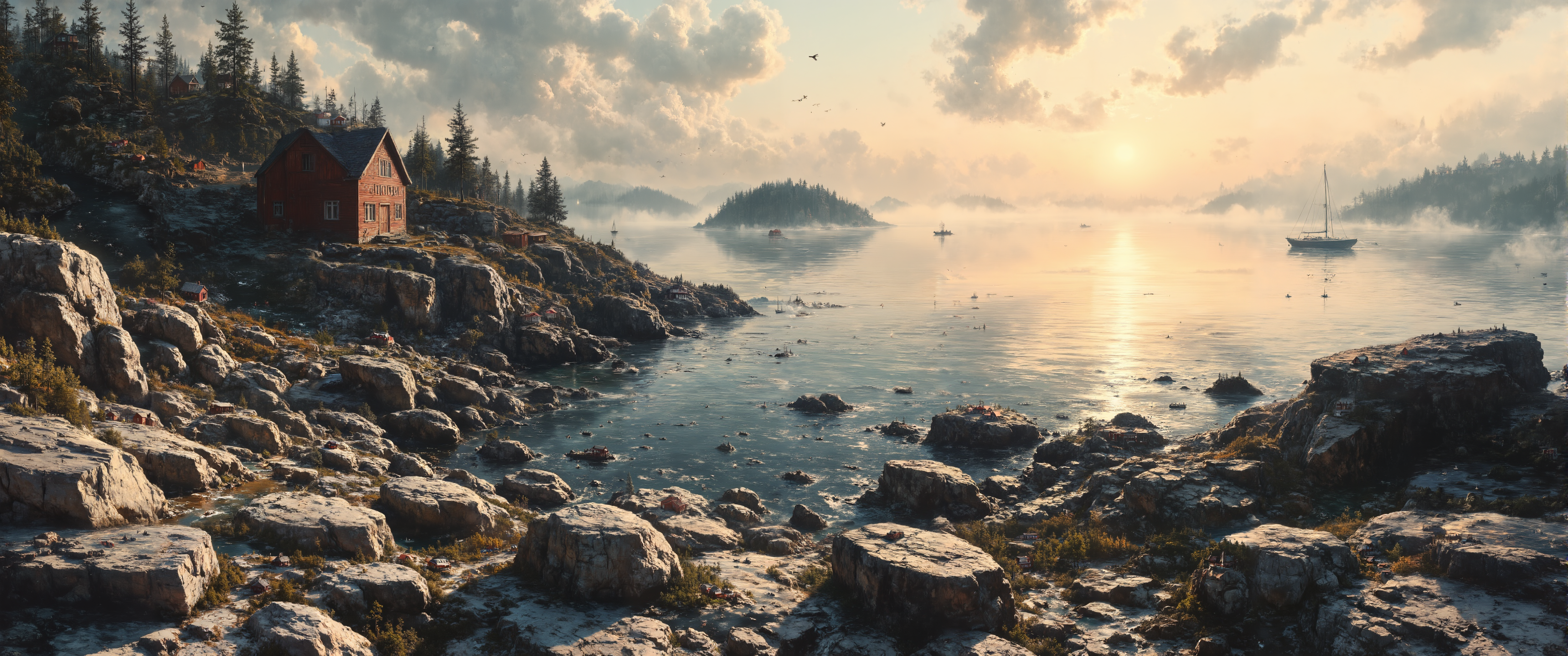 Majestic digital artwork of a striking Swedish archipelago scene, featuring countless granite islets emerging from the crystal-clear Baltic Sea waters at sunset. Thousands of smooth, rounded rocks in warm amber tones contrast against deep teal waters, creating a dramatic mosaic landscape. Sparse pine trees cling tenaciously to larger islands, silhouetted against a gradient sky of pastel peach, lavender, and indigo. Traditional red wooden cottages with white trim nestle on scattered islands, their reflections rippling in the calm waters. Distant sailboats navigate the labyrinth of islands as seabirds soar overhead. Early evening light casts long shadows and creates a golden glow across the scene, highlighting the intricate textures of lichen-covered rocks and weathered wooden docks. Atmospheric mist hovers low over distant waters, 8K ultrarealistic, photographic quality, stunning composition with foreground rock details transitioning to the vast island-dotted seascape. <lora:Mezzotint_Artstyle_for_Flux_-_by_Ethanar:0.8> <lora:Rainbow_on_black_style-000003:0.4> <lora:aidmaMJ6.1-FLUX-v0.4:0.4> <lora:MysticFantasy:0.2> <lora:flux_dev:1>