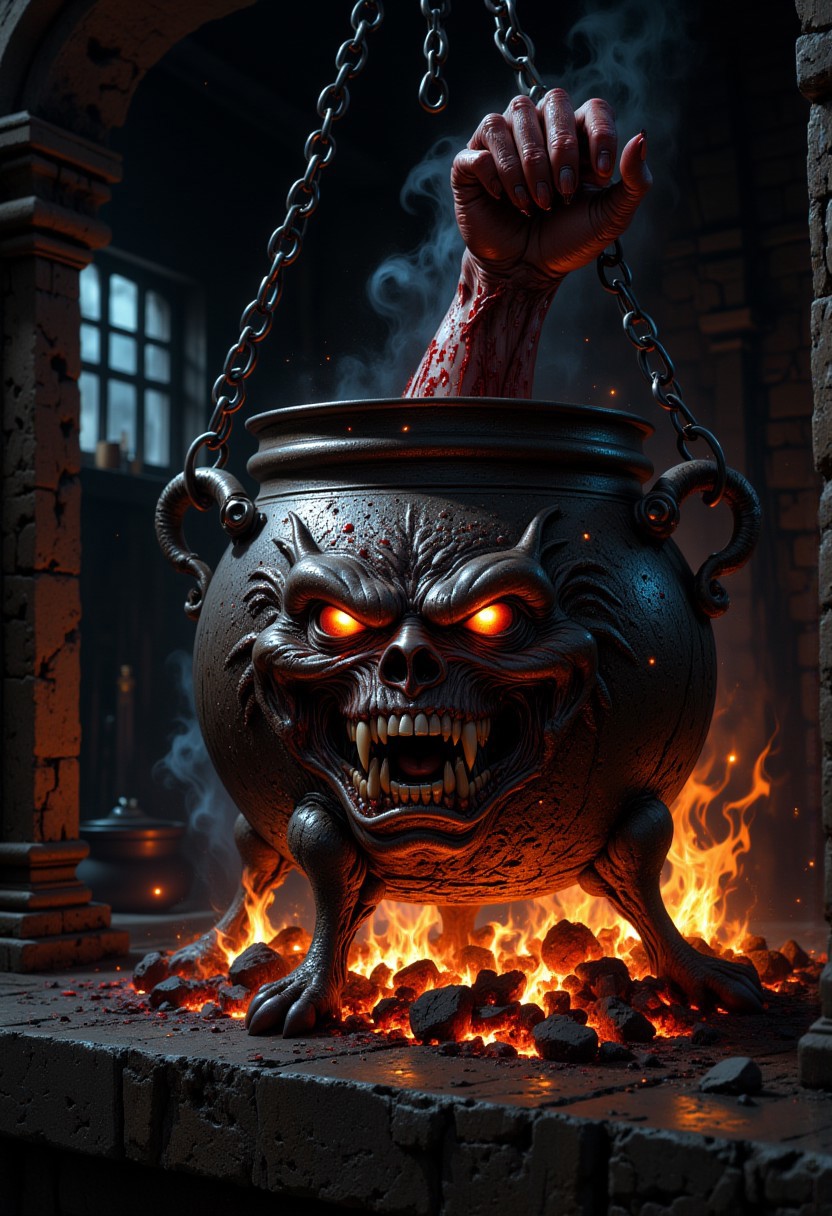 A hyper-realistic portrait, photorealistic photo close-up image, Image is a creepy, sinister and frightening fantasy digital illustration featuring a semi realistic glowing demon cauldron with sinister eyes that is hanging down from a chain over a kitchen fire in fireplace. A bloody arm is sticking up from out of the pot (photography, high-resolution, dynamic, energetic,hyper-realistic, dramatic lighting, shallow depth of field.)