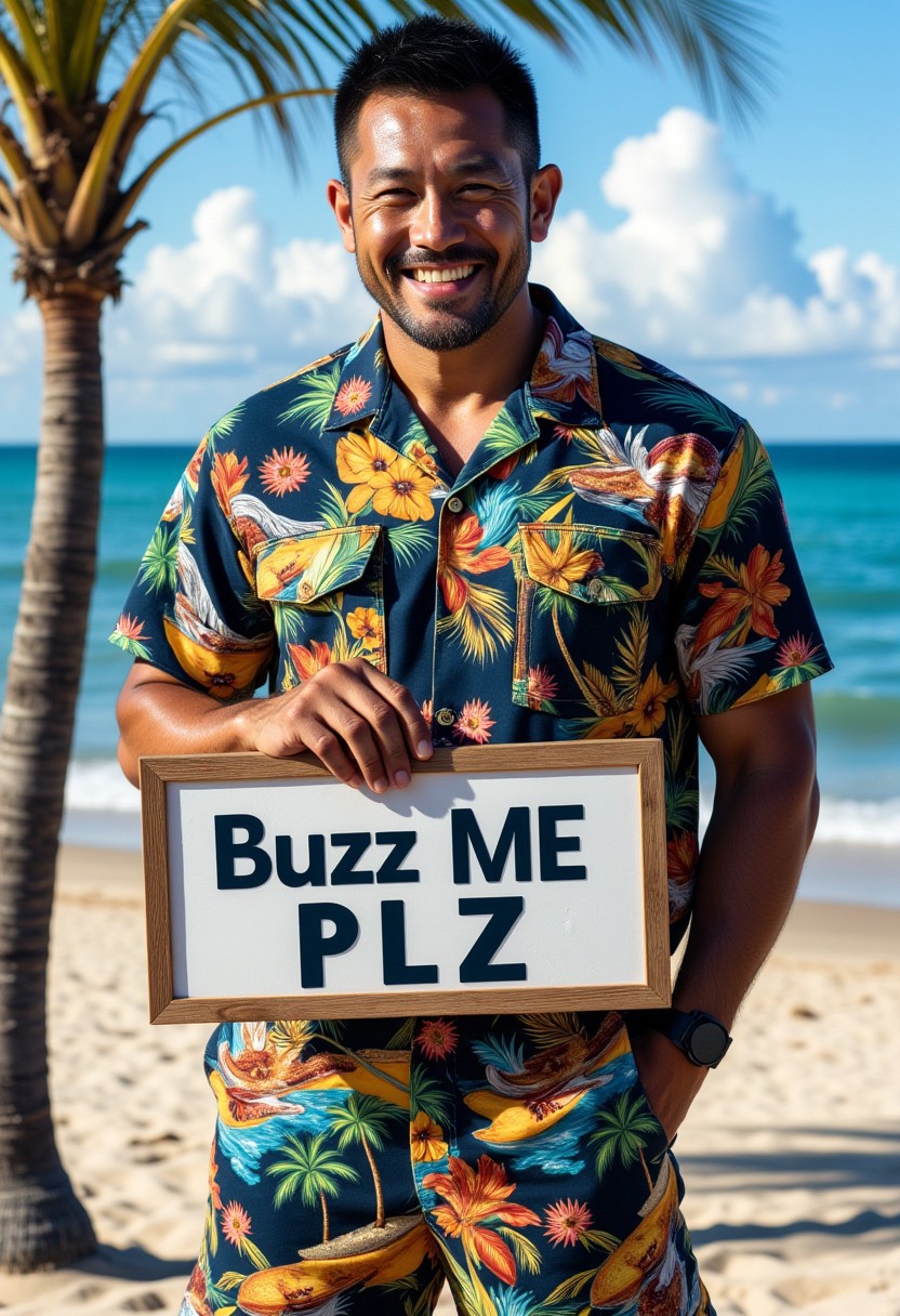 Smiling USA soldier standing akimbo.holding a board with words"Buzz Me PLZ", His uniform is playfully hawaiian shirt patterened cloth, with conconut trees and beach surf. .