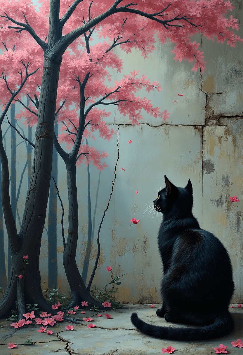 A cat painting sakura trees on a cracked concrete wall, each one toward a painted forest, cinematic romanticism, dark surrealism, gothic atmosphere, vintage fashion, haunting narrative, dreamlike environments, crumbling interiors, surreal symbolism, emotional tension, dramatic lighting, romantic noir, expressive textures, abandoned architecture, moody color palette, isolated figures, psychological ambiguity, mysterious elegance, painterly realism, narrative surrealism, melancholic stillness