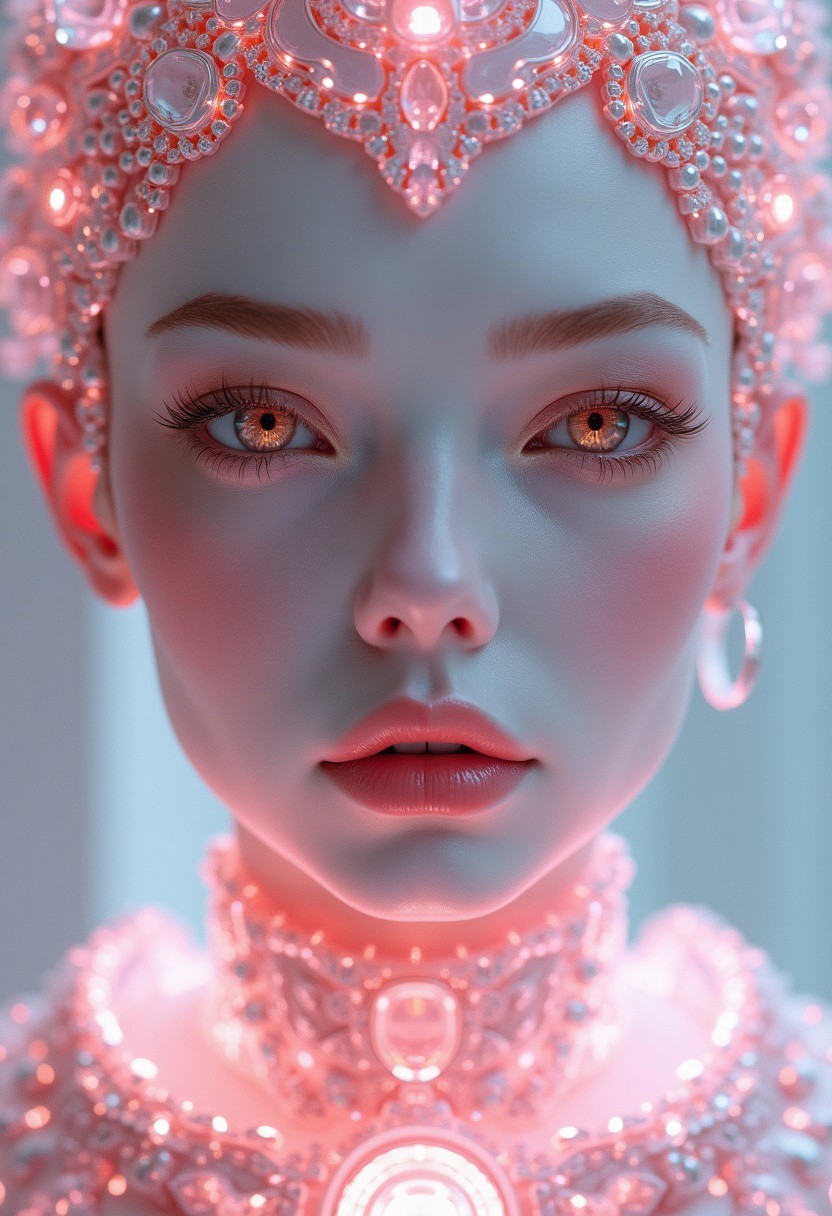 A hyperrealistic, masterpiece close-up portrait of a regal futuristic empress, ethereal and divine, with porcelain white skin glowing with a soft rose-ivory gradient. Her symmetrical facial features are illuminated by radiant blush-pink crystal light, and her eyes shimmer in shades of icy rose quartz with a subtle inner glow. Ultra-detailed facials are adorned with translucent pink crystal bead ornaments, embedded across her cheeks and brow like sacred circuitry. A futuristic silver-pink headdress, encrusted with shimmering rose crystals and pearls, crowns her head like a divine halo. Around her neck, an intricate baroque-style armor collar sparkles with opalescent pink gemstones, refracting the light like fractured glass. A glowing magenta-pink crystal core pulses from her chestplate, echoing her inner power. Her makeup is delicate yet striking: soft golden-pink eyeshadow, nude metallic lips with a rosy sheen. The ambient sci-fi background bathes her in a cool-pink glow with scattered bokeh lights, creating a cinematic depth of field. Every crystal surface refracts light with dazzling diffraction and subtle total internal reflection, bringing sharp 8K ultra-detailed definition to this fantasy-sci-fi fusion masterpiece