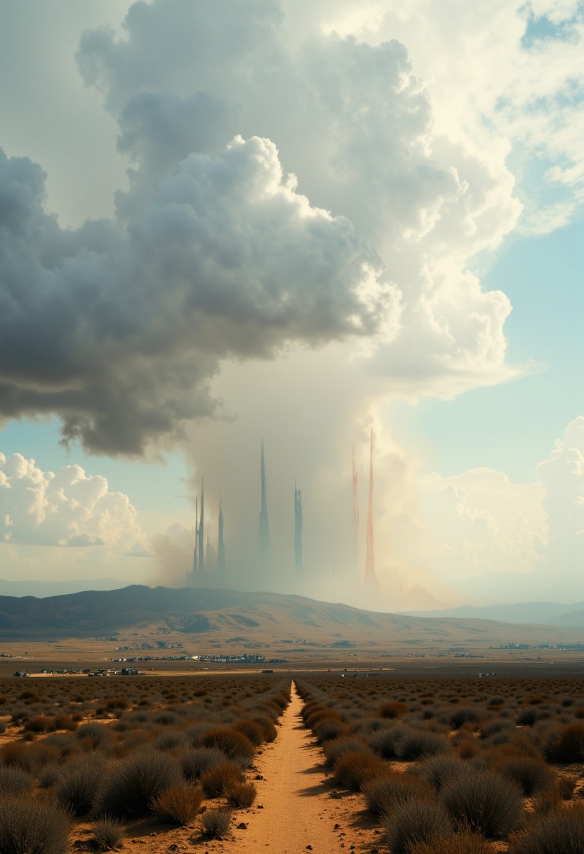 artilands02, a desolate color drenched Desert Landscape, only glimpses of RGB digital distortions are visible behind a detailed billowing wall of Clouds, atmospheric lighting, atmospheric haze, desolate towering Obelisks resembling long bee hives that reach into the universe above, cutting holes into the Clouds Casting Long shadows across the Landscape, a moody Milky and desaturated colored Fog covers the scenery