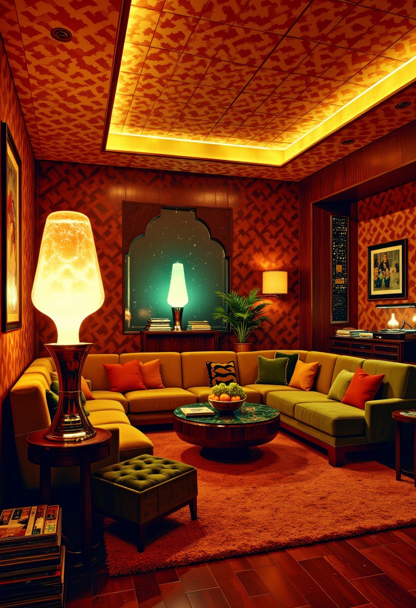 The Groovy Lounge of 1977 A chic, mid-century modern lounge, dripping with psychedelic 70s vibes. The walls are covered in bold orange, mustard yellow, and brown geometric wallpaper, while a plush, sunken conversation pit with velvet cushions in avocado green and burnt sienna dominates the center. A shag carpet stretches across the room, leading to a corner where a record player spins Fleetwood Mac, surrounded by stacks of vinyls. The air smells of incense, vintage perfume, and fresh espresso. A large lava lamp bubbles hypnotically, casting soft, shifting glows on the wood-paneled walls.