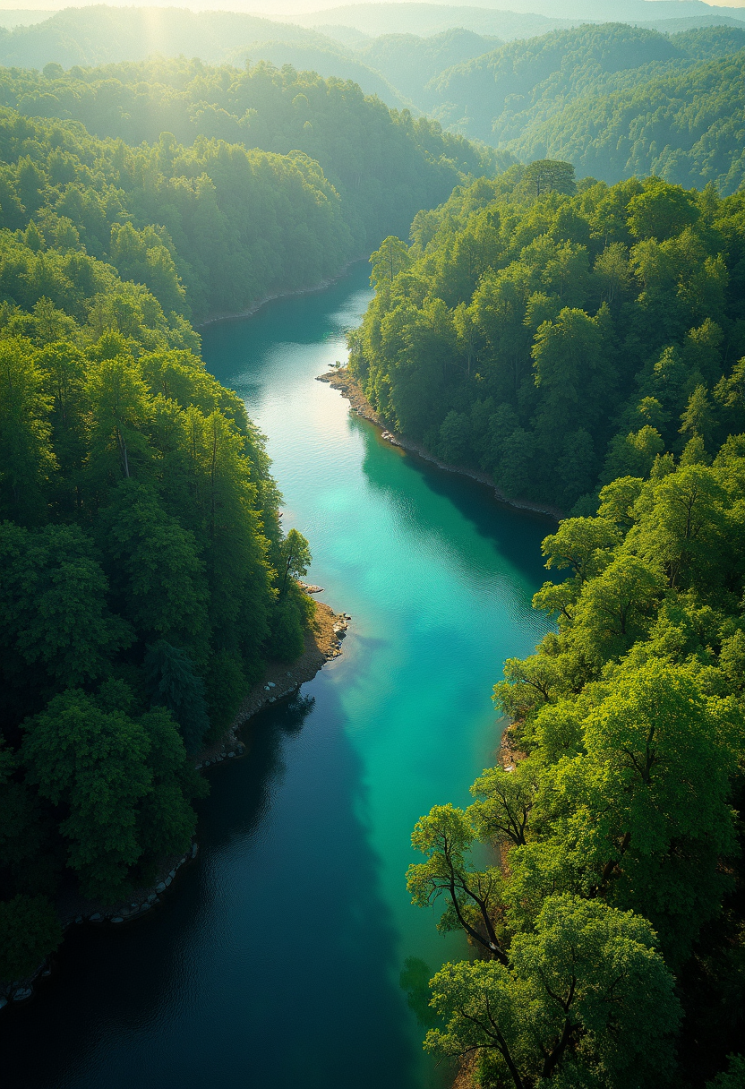 Generate a stunning aerial photograph of a vast,lush forest stretching as far as the eye can see. The vibrant canopy of emerald green leaves forms a dense,tapestry-like layer,with shafts of golden sunlight filtering through and casting dappled shadows on the forest floor below., In the midst of this natural wonderland,a majestic lake sparkles like a sapphire jewel,its calm surface reflecting the surrounding beauty., The water's edge is dotted with towering trees that seem to lean in,as if sharing ancient secrets. A meandering river flows into the lake,its gentle current carving a path through the lush undergrowth., The overall composition should emphasize the sense of scale and grandeur,with the camera positioned high above to capture the forest's immense expanse. The image should be rendered in crisp,detailed resolution to showcase every texture - from the velvety moss on tree trunks to the iridescent sheen on a dragonfly's wings as it flits near the water's edge.,