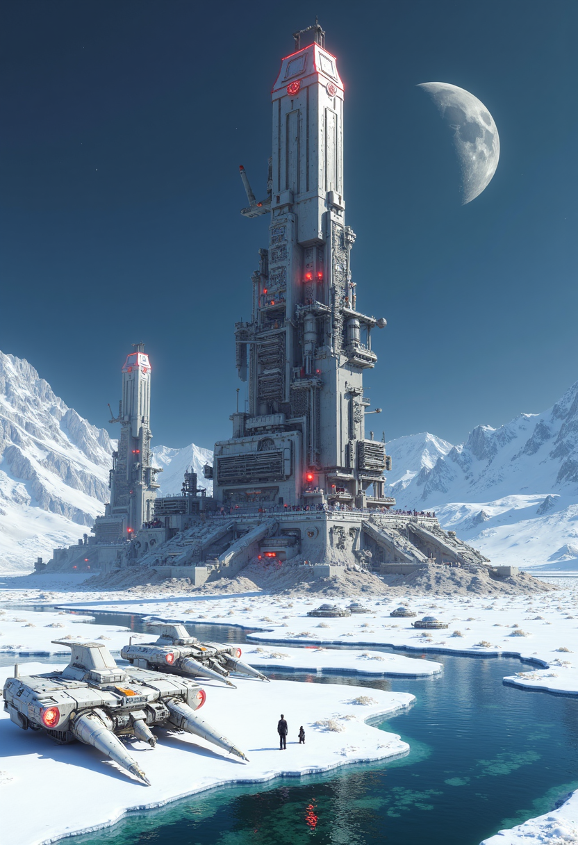 Create image is a highly detailed digital artwork depicting a futuristic,snowy landscape with a towering,complex space station at its center. The space station,constructed from metallic components,stands tall and has multiple levels with various structures and equipment. It is illuminated with bright,glowing red lights,giving it a futuristic and high-tech appearance. The station is positioned on a snow-covered plateau with a large,icy river flowing through the foreground., The background features snow-capped mountains and a clear,deep blue sky with a large,full moon dominating the upper right corner. The moon is slightly hazy,adding a sense of depth and realism., In the foreground,several small,sleek,white spaceships with pointed wings and red lights are parked on the ice,suggesting they are either in use or ready for launch. A small group of figures,dressed in dark clothing and wearing helmets,stands near one of the ships,adding a sense of scale and human presence to the otherwise cold and alien environment. The overall color palette is dominated by cool blues,whites,and grays,enhancing the icy and desolate atmosphere. The artwork is highly detailed,with sharp lines and realistic textures,indicative of modern digital art techniques.,<lora:yug-soares-v1:0.4>,YFG-SRS,<lora:flux.1_lora_flyway_Epic-detail_v2:0.8>,