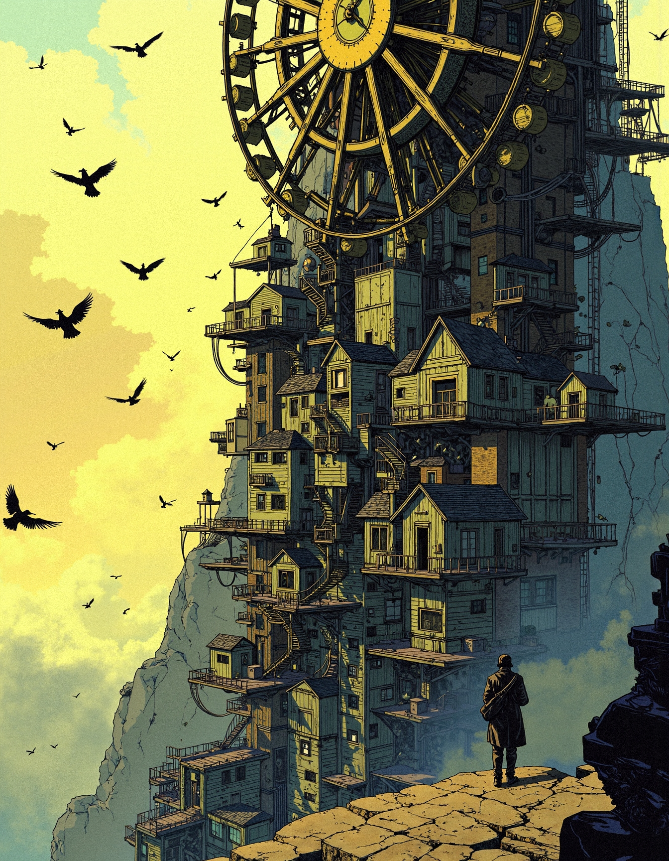 Comic book illustration, A fantastical vertical city rises from the cliffs, a mesmerizing fusion of impossible architecture and celestial phenomena, where endless staircases wind through a chaotic yet harmonious maze of houses, towers, and suspended platforms, each adorned with intricate balconies and golden-lit windows. An immense ferris wheel-like clock looms at the pinnacle, its hands frozen in time as floating orbs—miniature planets, astrolabes, and celestial artifacts—drift through the air, defying gravity as they weave between soaring mechanical birds and ornate bridges connecting sky-high observatories. On the ground, a lone traveler gazes upward in awe, surrounded by scattered artifacts, gears, and relics of an ancient civilization that seems to pulse with forgotten magic. The entire metropolis is alive with unseen energy, where the smallest details—from books resting on windowsills to tiny figures moving through the city’s intricate walkways—create a living, breathing world untouched by the constraints of logic. The sky, painted with soft golden hues and drifting clouds, casts a surreal, dreamlike glow over the entire landscape, making the entire city appear as though it exists within the pages of a story not yet written. Hyperrealistic architectural fantasy with immense world-building, an intricate interplay of celestial mechanics and surreal vertical cityscapes, and a breathtaking atmosphere that captures the wonder of an ever-expanding metropolis floating between reality and imagination. <lora:Comic_Style_-_FLUX:0.7000000000000001>
