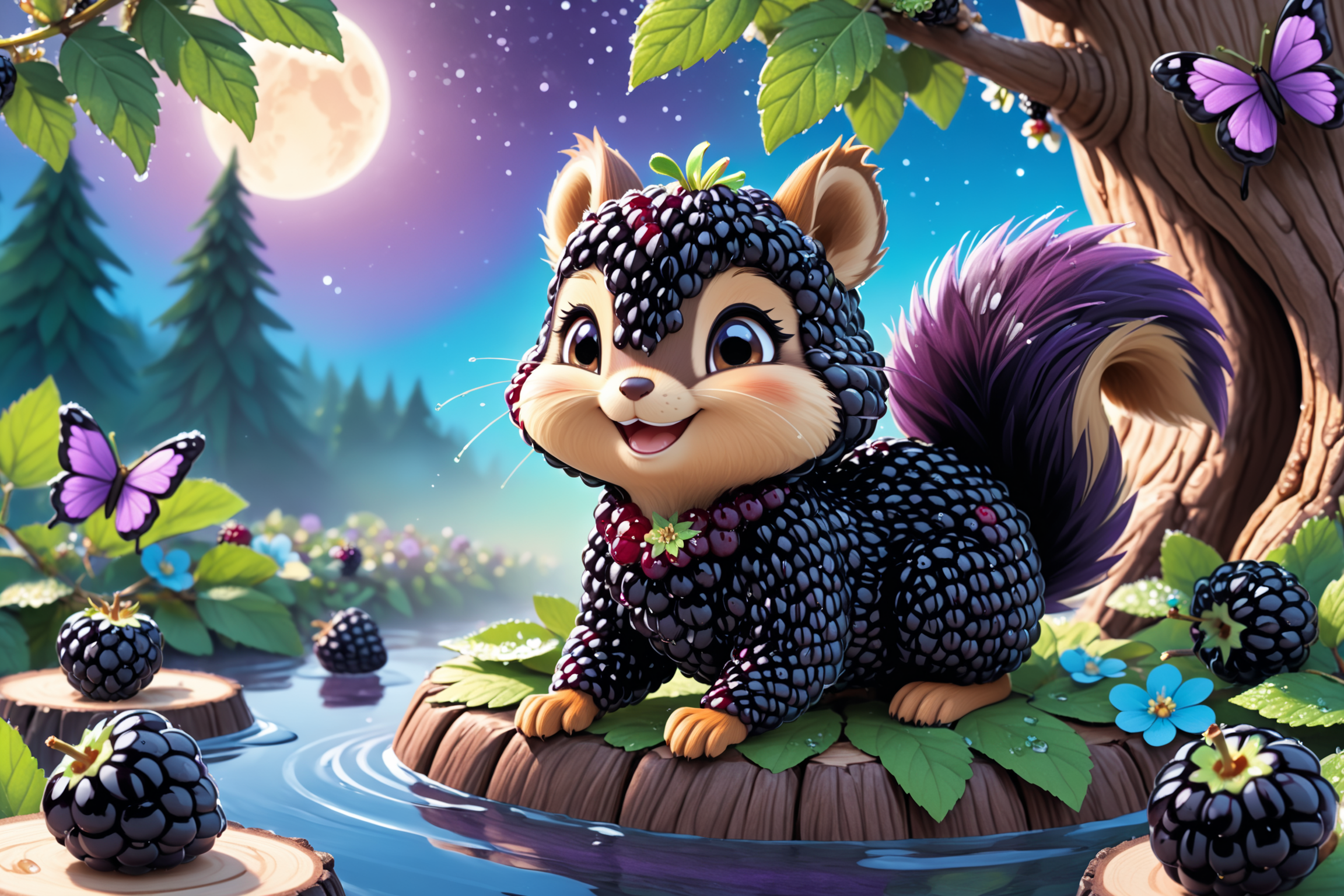 a cute chipmunk with chubby cheeks, striped back, brown fur, stuffing blackberries in its cheeks, solo, blackberryworld, with pastel purple fur, dreamy and light, glowing with a blackberry aura, blackberryworld, playful wink while tossing a blackberry, small smirk, one eye closed, blackberryworld, a cozy treehouse with wooden planks, fairy lights, leafy canopy, now transformed by blackberryworld with planks covered in blackberry vines, purple juice dripping, and berry flowers glowing, detailed background, splashing in a stream of blackberry juice, purple droplets flying, blackberryworld, cheerful while playing with a blackberry, ears perked, blackberryworld, three-quarter view shot, full body visible, a blackberryworld butterfly chase with animals running, blackberry butterflies fluttering, rainbow meadow transformed by blackberryworld, a fluffy blackberry toy, hugged closely, blackberryworld, on a flower bed with blackberry flowers, colorful and soft, blackberryworld, pastel sky with blackberry shimmer, soft pinks and blues with purple glow, gentle glow, blackberryworld, late night, dark sky with blackberry glow, bright stars, cold air, blackberryworld, best quality, vibrant colors, animation 3D style, soft shading, high detail, smooth texture, not realistic, not photorealistic, highres, 4K resolution, masterpiece, best quality, amazing quality, very aesthetic, soft lighting, minty greens with blackberry purples, soft greens with purple accents, blackberryworld, warm light with blackberry sparkles, purple accents, blackberryworld, overhead shot, <lora:Blackberryworld_Morth:1>