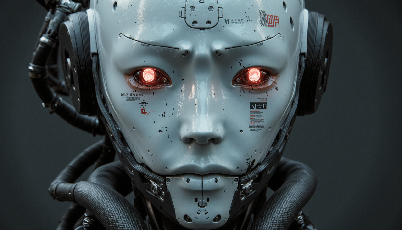 CYBER_CORE_UT (geisha::0.9) (android robot face::2.2),white ceramic material,many mechanical details,seams, scuffing, rust,(camera lenses instead of pupils:1.5) (traditional intricate japan clothes:1.5) (style by Yuri Shwedoff),shallow depth of field, vignette, (Fujicolor Superia X-TRA 400) Armor