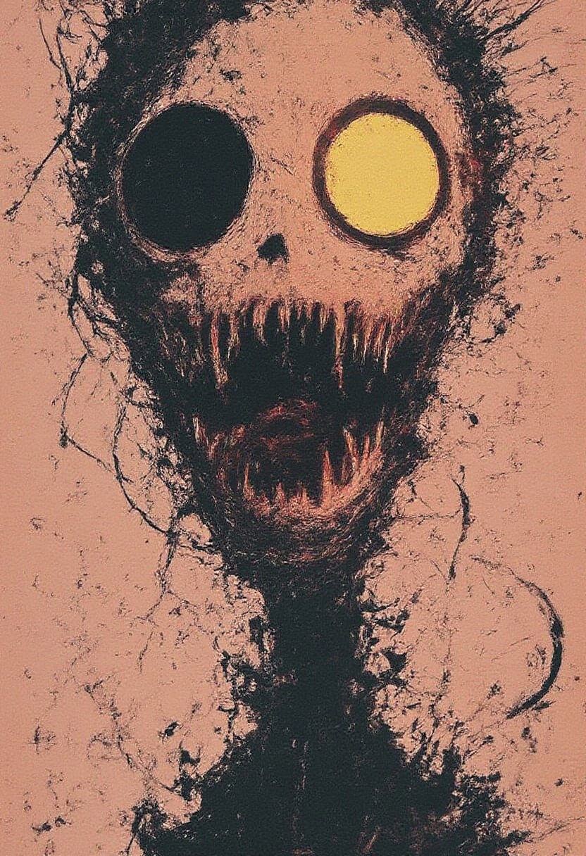an adroit d3press1on illustration, in the playful scribble drawing style. triadic complementary colors, dark and moody surreal nightmare of an eerie laugh, a mouth distorted, wide grin, and full of sharp nails, in the realm of the damned dreaded souls, teal and orange color grading, yellow abstract geometric gradients stain the orangish background <lora:d3press1on:0.9>
