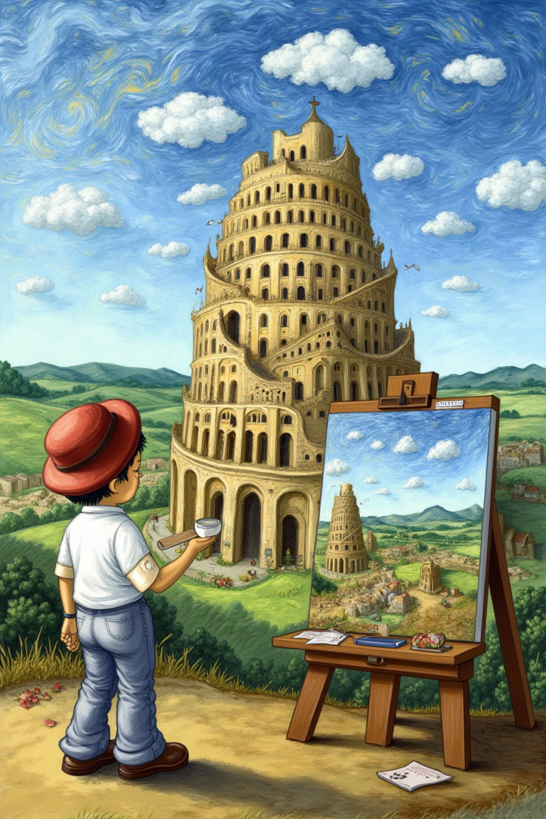 <lora:tower-of-babel-flux-d:1.0> A whimsical scene where an artist with a beret stands before a canvas, painting the Tower of Babel as it actually looms in the background. The painter's style reflects onto the real world, blending strokes and reality. The sky swirls like Van Gogh, while the tower winds into the clouds. Surreal, playful atmosphere, no watermark or text.