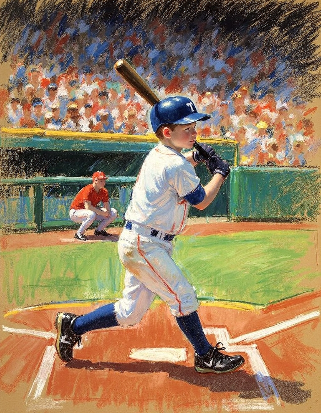 marycassatt2 drawing, a boy playing baseball in a crowded stadium