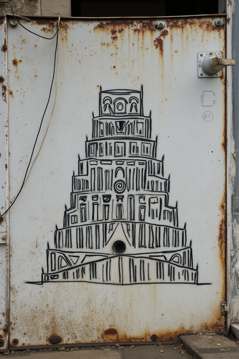 <lora:tower-of-babel-flux-d:1.0> A corroded metal wall bears the stylized emblem of the Tower of Babel, as if sprayed by a rebel artist. The lines are geometric, minimalistic, but the decay gives it a haunting aura. The wall is streaked with rust, and wires hang nearby â all in a gritty, cyberpunk post-collapse aesthetic. No watermark or added text.