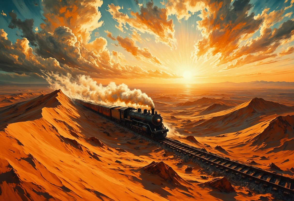 A landscape of tall dunes in a wide open desert that stretches to the horizon. The sun is just rising above the horizon, painting the sky in vivid hues and lighting the dunes and the sand. Epic clouds catch the sunlight and a storm seems to be building in the distance. The dunes move like waves. Train tracks wind through the desert. A steam engine pulling a train follows the tracks, billowing clouds of steam.