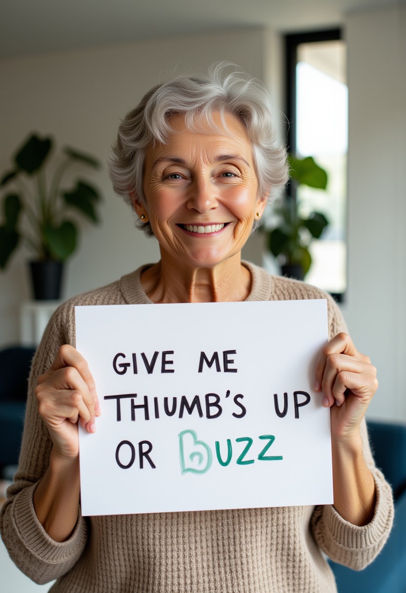 mature woman holding a sign it says "give me thumbs up or buzz",