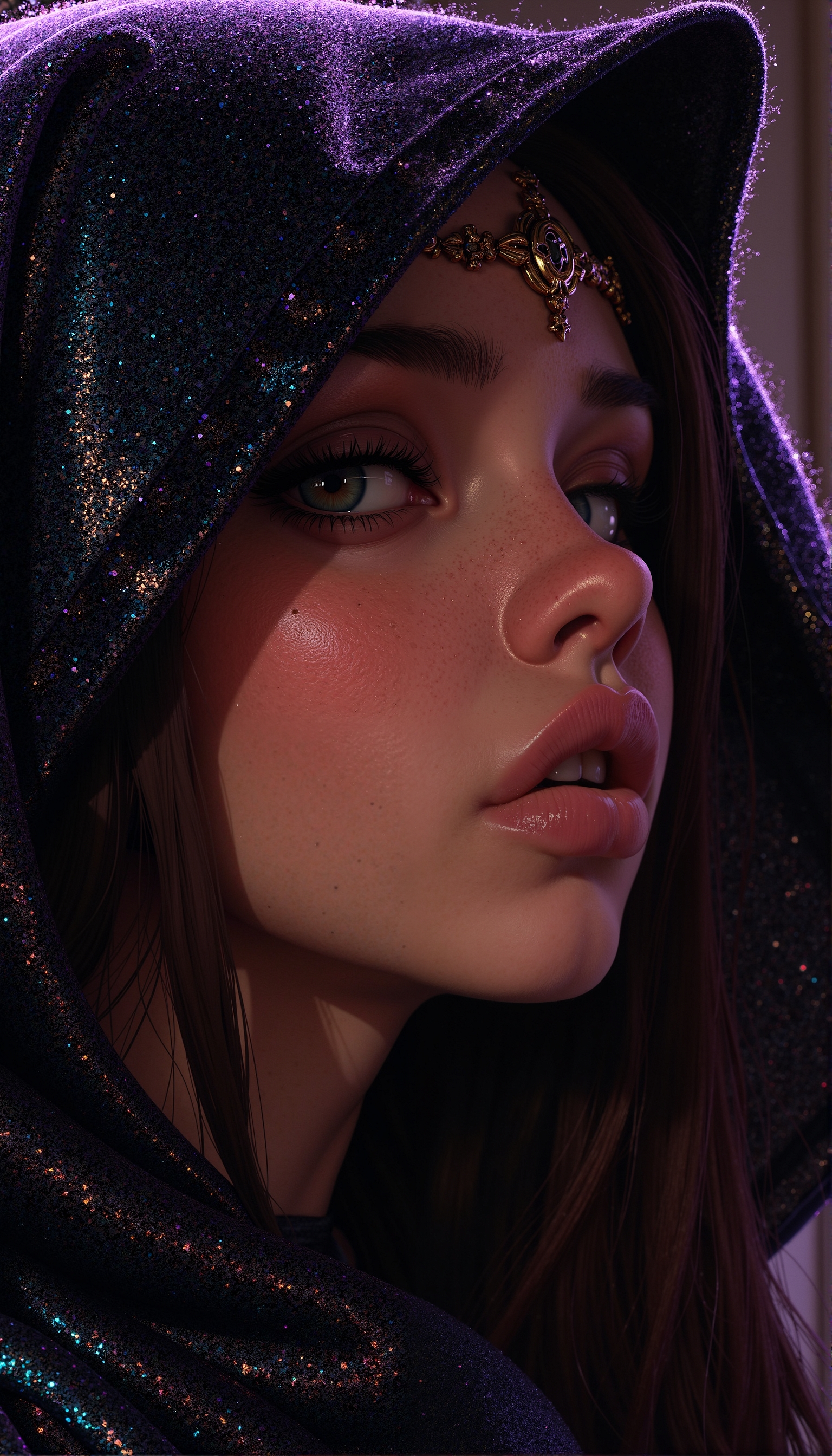 hyper-detailed, modernretroanime, Anime, anime screencap, cel shading, aidmaDarkGothicAnime, aidmansfwunlockfluxponystyle, close-up, very dark skin, long eyelashes, thick lips, 3. dramatic half-lit close-up of a woman draped in an iridescent black metallic hood, soft light bouncing off sharp creases in fabric, (pose: slightly side-facing with chin raised and one eye dramatically obscured by hood), warm glowing brown skin, subtle freckles, highly detailed sculpted nose and lips, moody cinematic lighting with starry sparkle effects on hood edges, baroque gold headband peeking through under veil, soft focus background, FLUX hyper-realism <lora:FluxDFaeTasticDetails:0.4> <lora:MoriiMee_Gothic_Niji_Style_FLUX:0.4> <lora:MelkorMancin-FLUX:0.6>