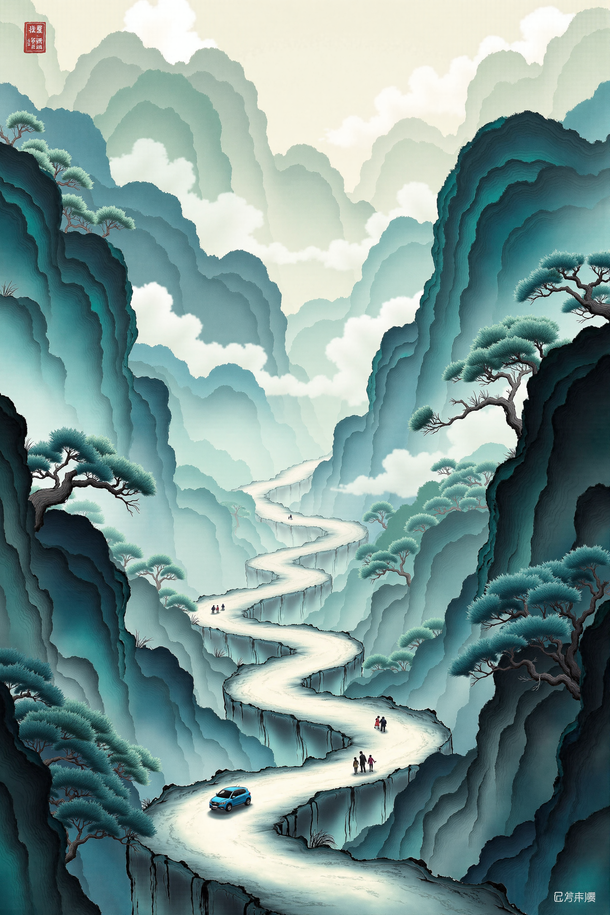 zgqtm_v3,Traditional landscape rendered with traditional splashed-ink landscape brushwork of mountain peaks and cloud mists,modern electric vehicles meticulously detailed driving on winding mountain roads,the silhouette of figures inside gazing out at the mountains and waters,in Zhang Daqian's artistic style,the fusion of ink wash and meticulous brush techniques,the collision of blue-green coloring and modern metallic textures,the inscription of "Oriental Intelligence" in calligraphy in the blank spaces,the texture of rice paper,vermilion seals,rendered in 8K ultra-high definition,