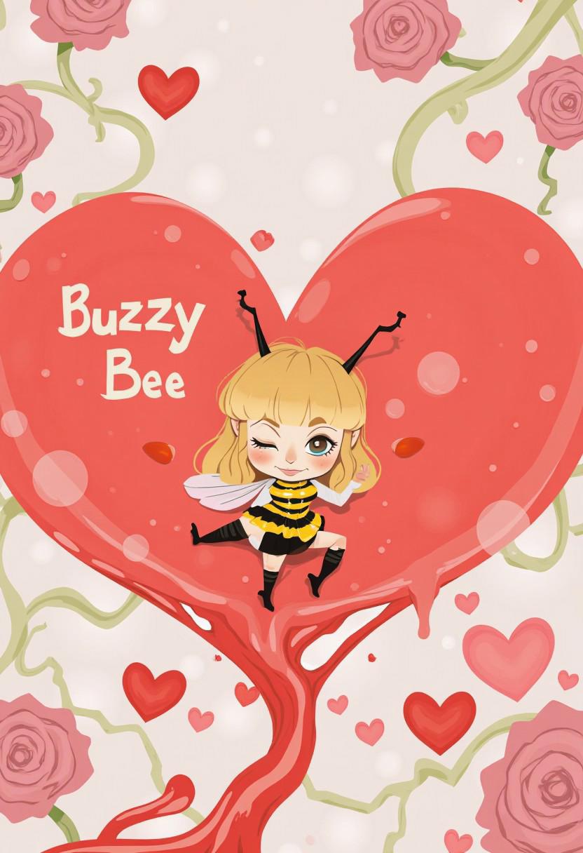 , score_9, score_8_up, score_7_up, score_6_up, Source_cartoon, 1girl, chibi girl, anthro bee girl, sitting on center of of caraf hearts, midjourneyv6.1, , view from above, text:"Buzzy Bee" , art by incase