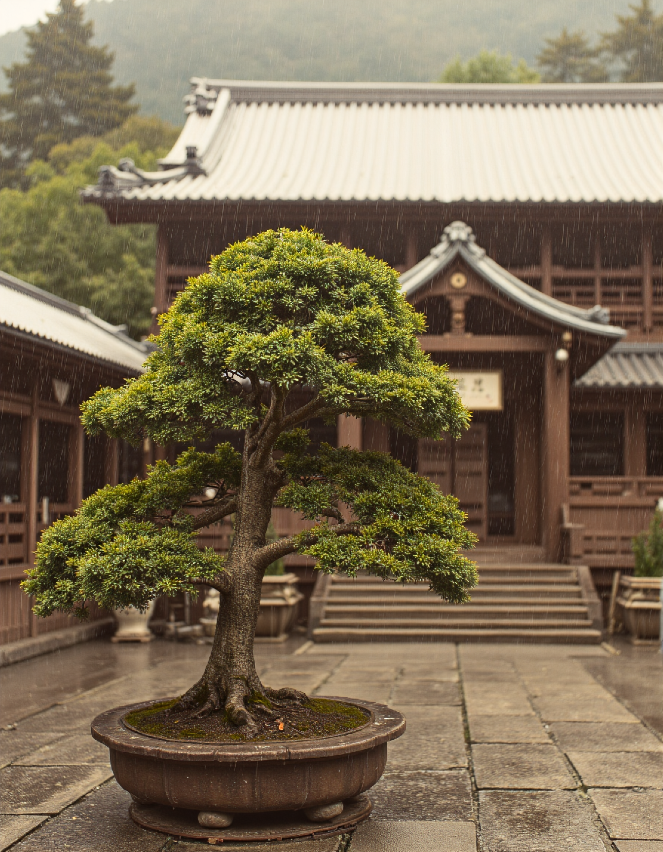 OldJapan style photo of a bonsai tree in front of a shrine, late afternoon, rain