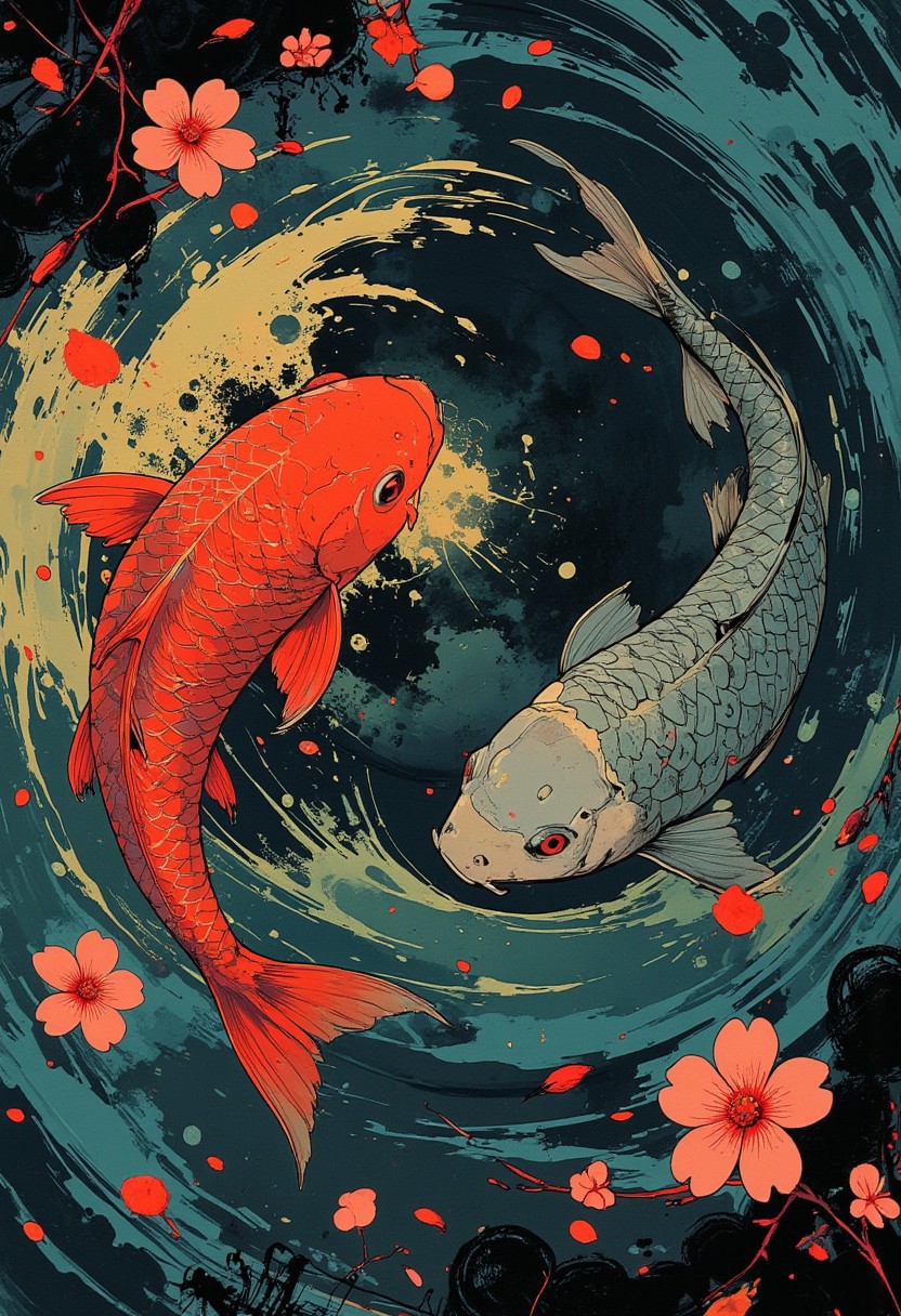 Two Koi fish swimming in a yin-yang formation through a swirling whirlpool, surrounded by cherry blossom petals, glowing ripples, and ink-style wave patterns.