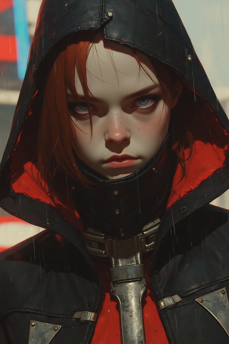 A hyper-realistic, highly stylized portrait of a copper-toned female assassin, her piercing grey eyes locked onto the viewer with calculated precision. Her short, asymmetrical hair is dyed crimson at the tips, partially obscured by a sleek matte black hood lined with scarlet. She wears a tight-fitting, high-collared obsidian leather jacket adorned with angular silver insignias, over a crimson underlayer of fine silk. A thin metallic faceguard wraps beneath her jawline. The background is a dystopian cityscape glowing in cold neon blues and reds, rain cascading down in blurred motion, amplifying her lethal, modern elegance.