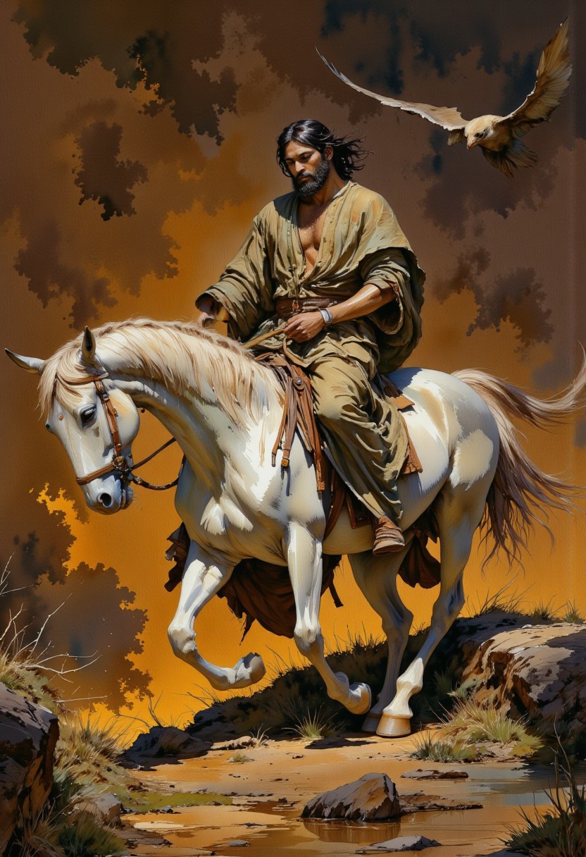 score_9, score_8_up, score_7_up, 8k high quality digital painting, masterpiece, very detailed, ultra realistic, (best quality) very detailed epic masterpiece, boris vallejo style, frank frazetta style, realistic oil painting, retro artstyle, full body, unearthly beautiful, a breathtakingly beautiful landscape, a beautiful sexy princess rides on a white unicorn, a flying dragon-monster follows her, sexy clothing, the setting sun casts long shadows, backlight, sunrise, enchanting landscape, fairytale-like, realistic detailed oil painting style Rembrandt style, Vermeer style, Dungeons and dragons atmosphere, heroic fantasy, realistic, realism, full body