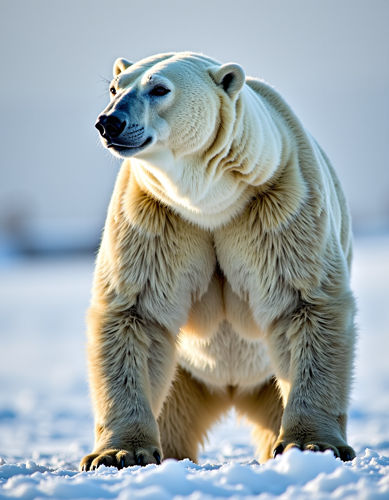 A dramatic snapshot of a majestic polar bear standing powerfully against a snowy backdrop, its thick fur and rugged features rendered in crisp detail by the soft, diffused light that falls upon it, with visible coarse film grain that adds a tactile quality to the image, capturing the intensity and majesty of this Arctic monarch as it surveys its frozen domain.